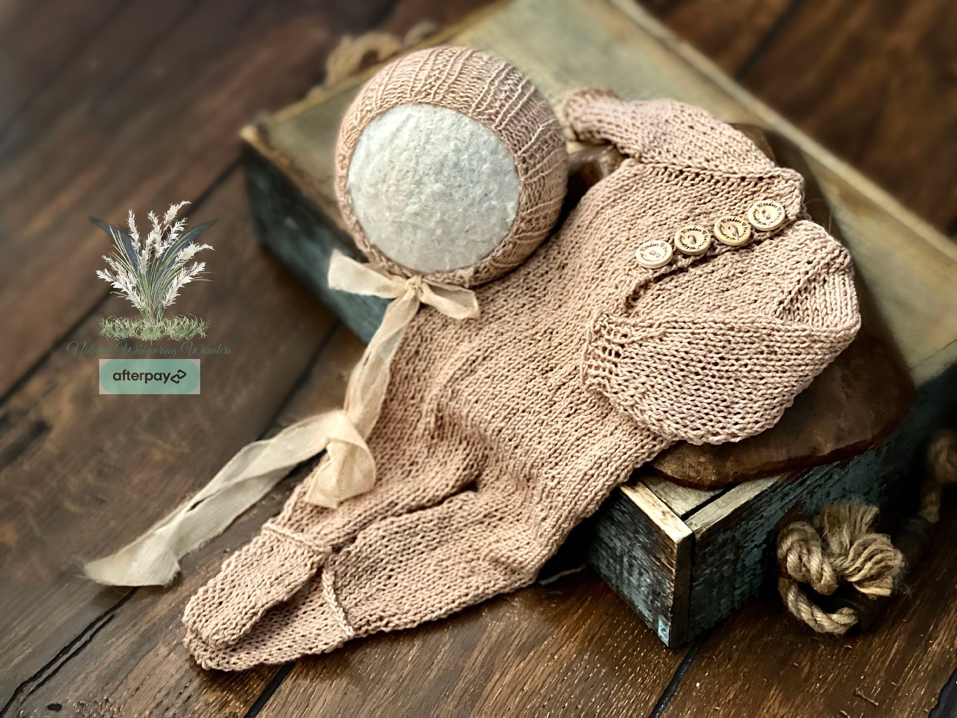 Hand knit with organic merino. This is soft and slightly textured yarn. Such a beautiful neutral shade. Like all of our Signature Sets. It comes with fold over footed pockets. You can choose to show off those or not.