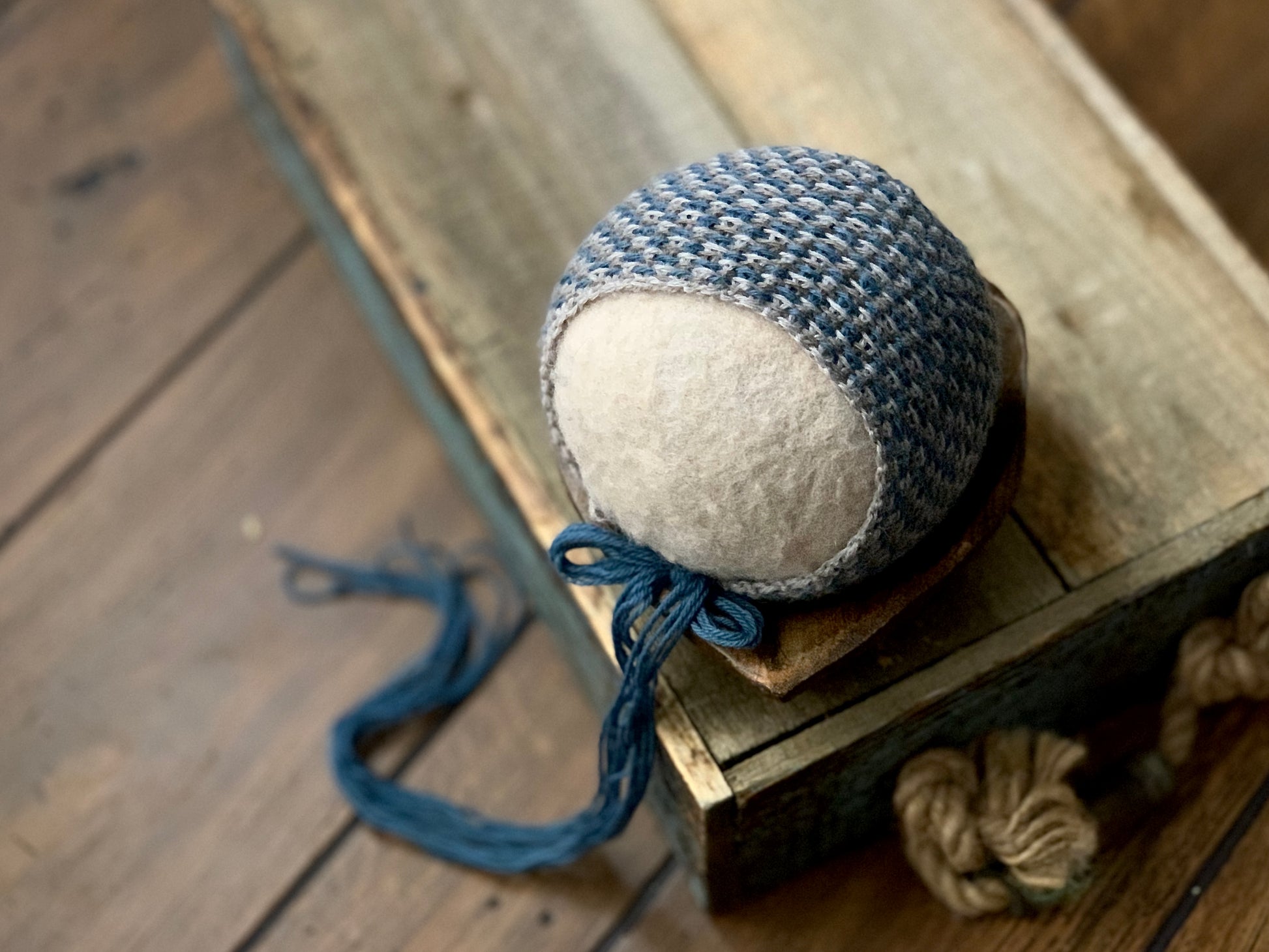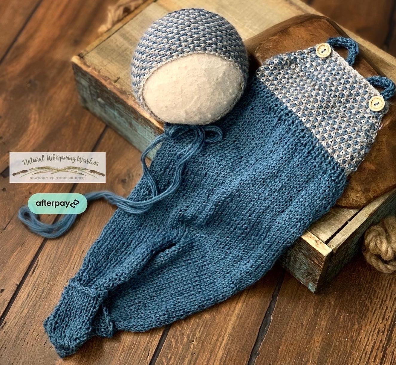 This set matches the blues Emmit Bonnet. Hand knit with 3 colours of merino form the bib of the outfit. With coordinating blue merino for the main body of the outfit. The romper hast straps with buttons for ease of dressing.  Like all of our Signature outfits this comes with fold over footed pockets. You can choose to show off those feet or not.