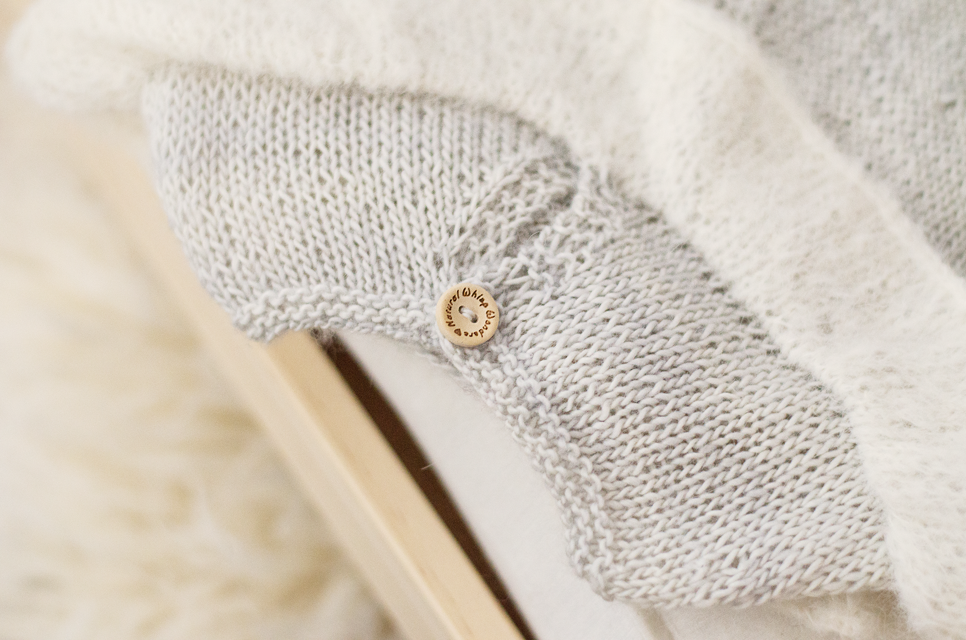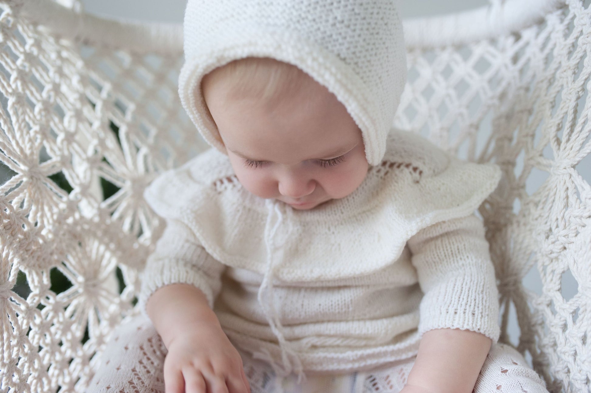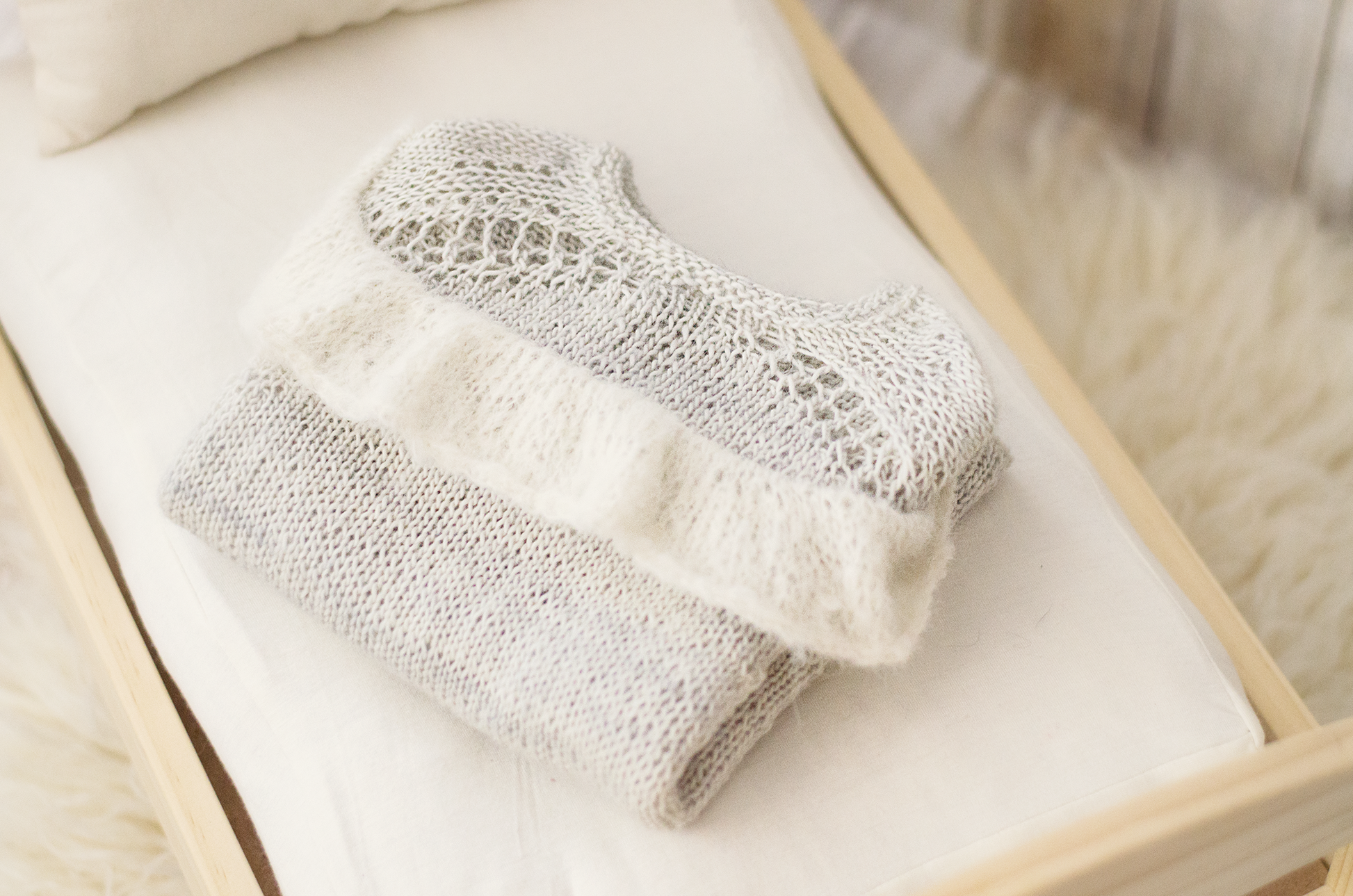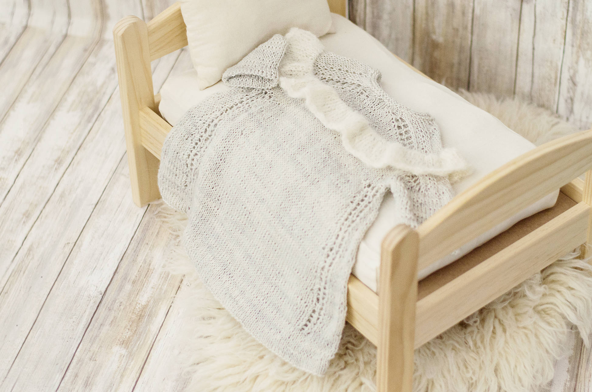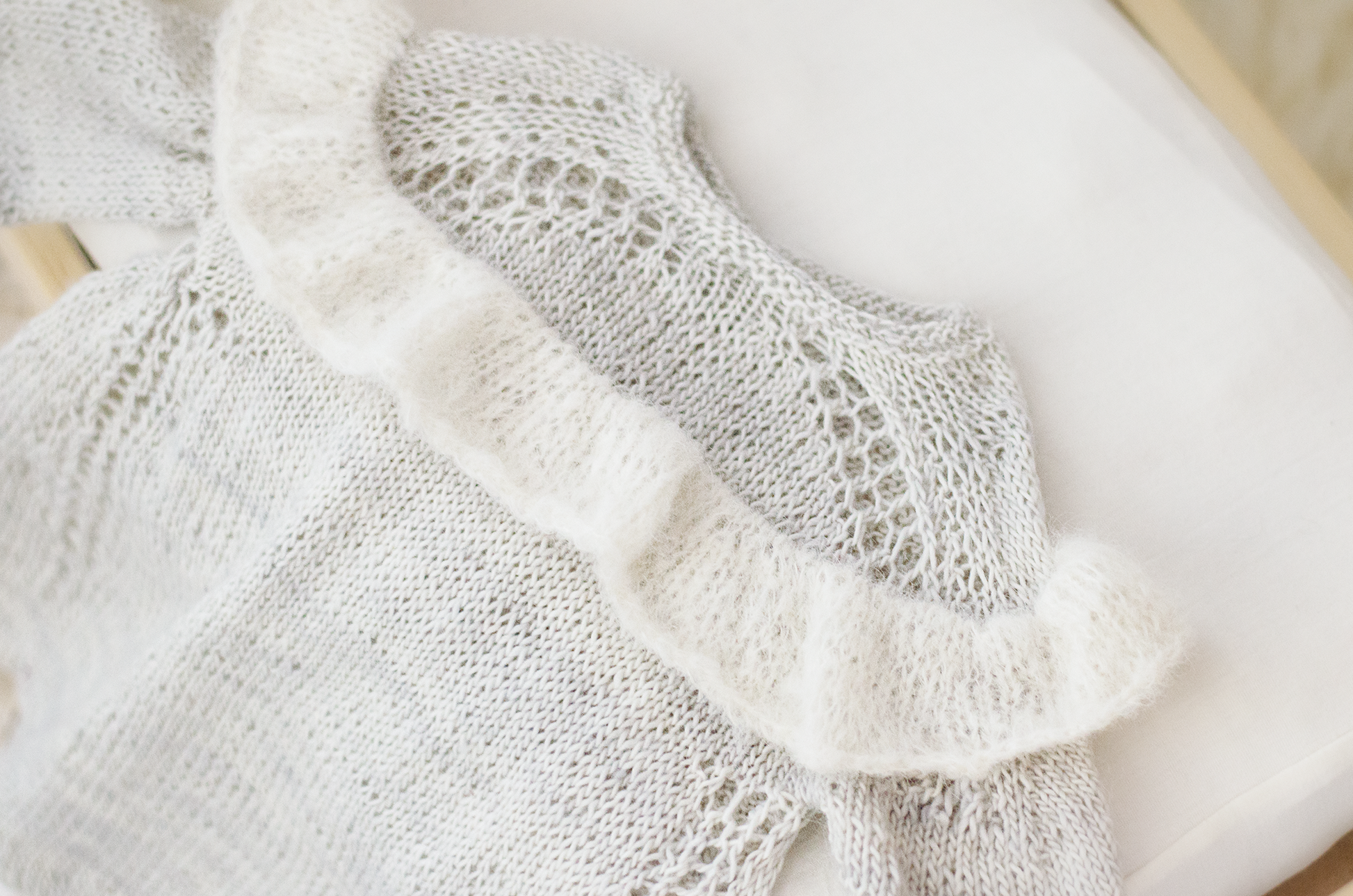 Hand knit with super soft, hand dyed, merino. Very pale creamy grey  with a coordinating alpaca ruffle. 6-12 months. This is knitted in a A-line and is very forgiving in size. You can use it as a tunic for older babies with bloomers or leggings.
