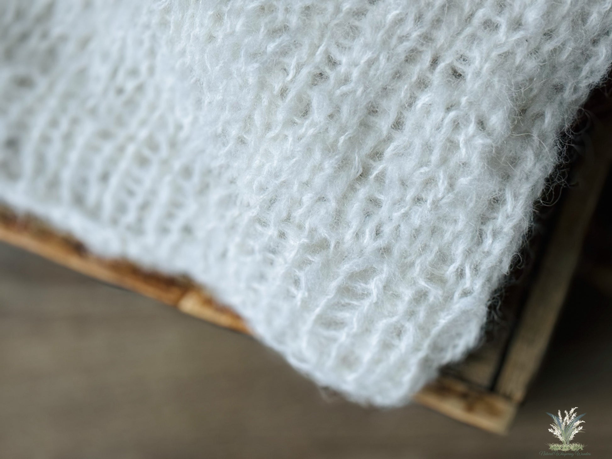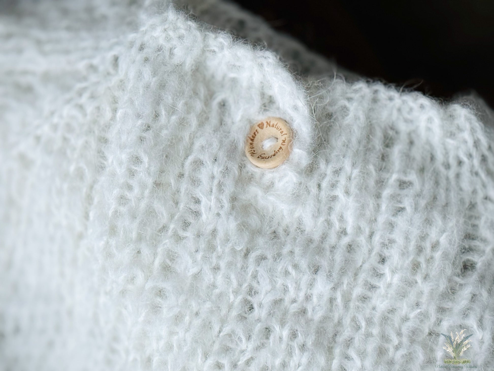 This is a beautifully hand knit sweater. Knit with brushed alpaca in a gorgeous off white colour. Has a button at the back for ease of dressing. Very stretchy and soft. If you like the oversized look, this could work off a newborn.