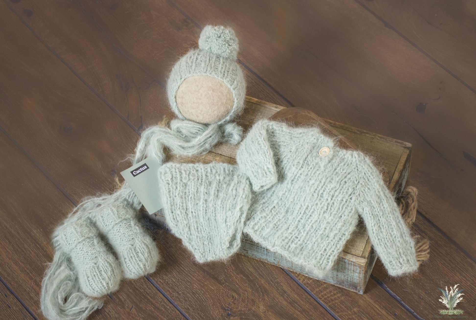 This heirloom-quality newborn set is hand dyed and hand knit with the softest brushed alpaca fibres — designed to bring a touch of luxury to every session.