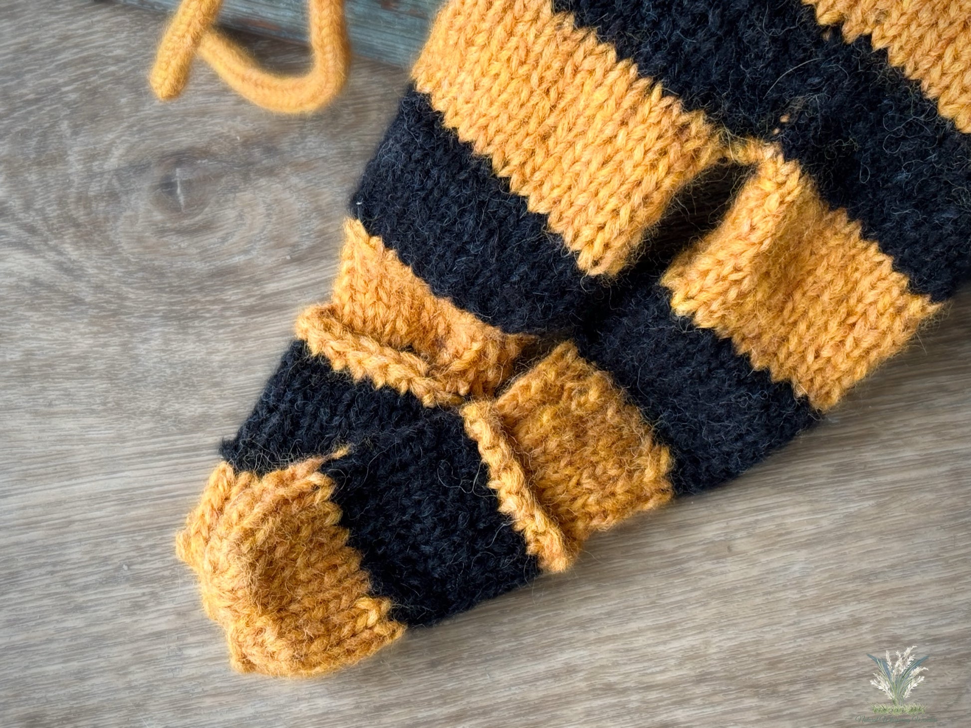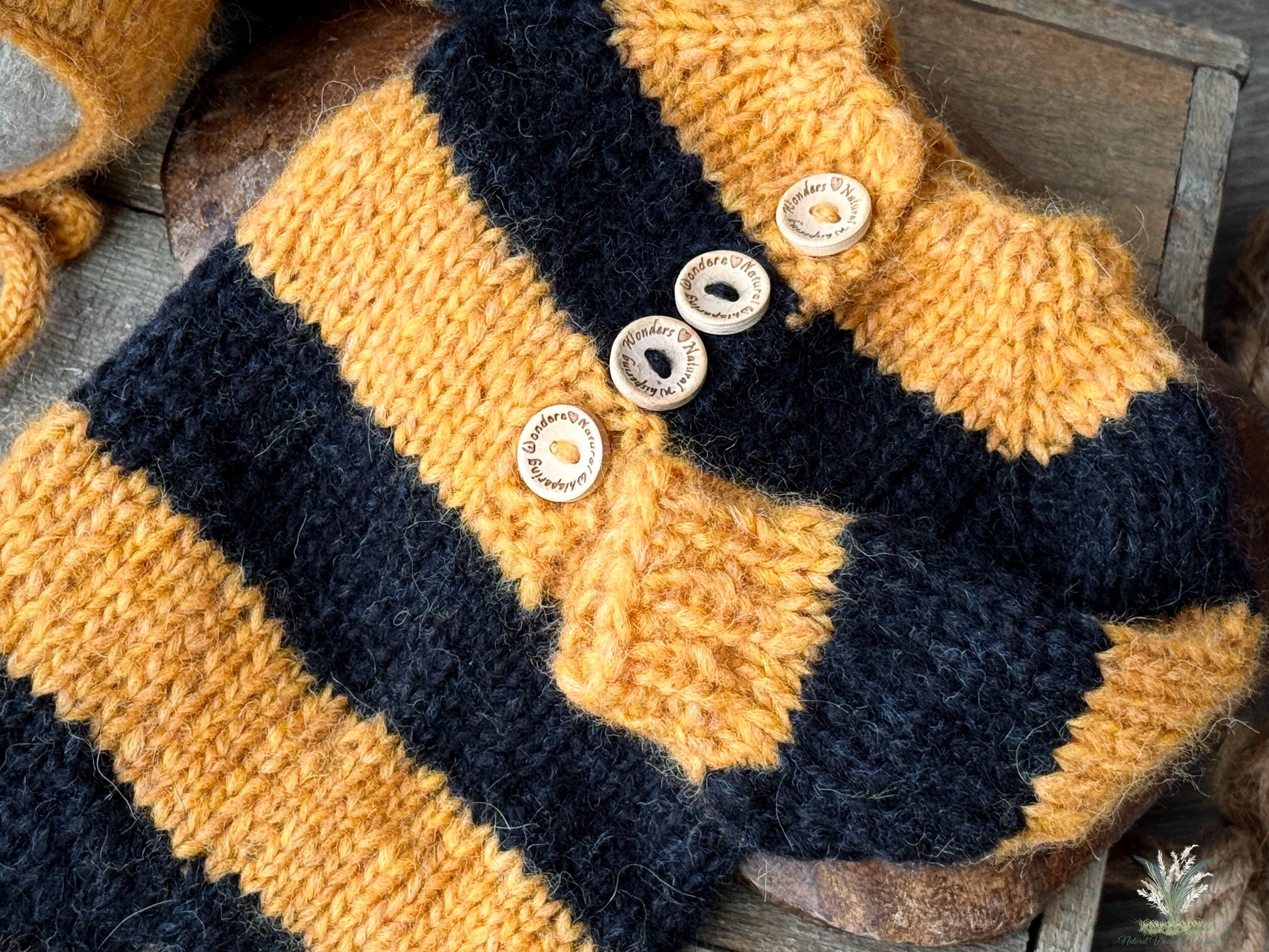 This originally was a custom order that I just fell in love with. I just had to add it as a preorder. This is hand knit with brushed alpaca. Perfect for covering up diapers. It’s not the traditional yellow. I love the more sunflower tone here. Like all of my Signature outfits it comes with fold over footed pockets. You can choose to show off those feet or not.