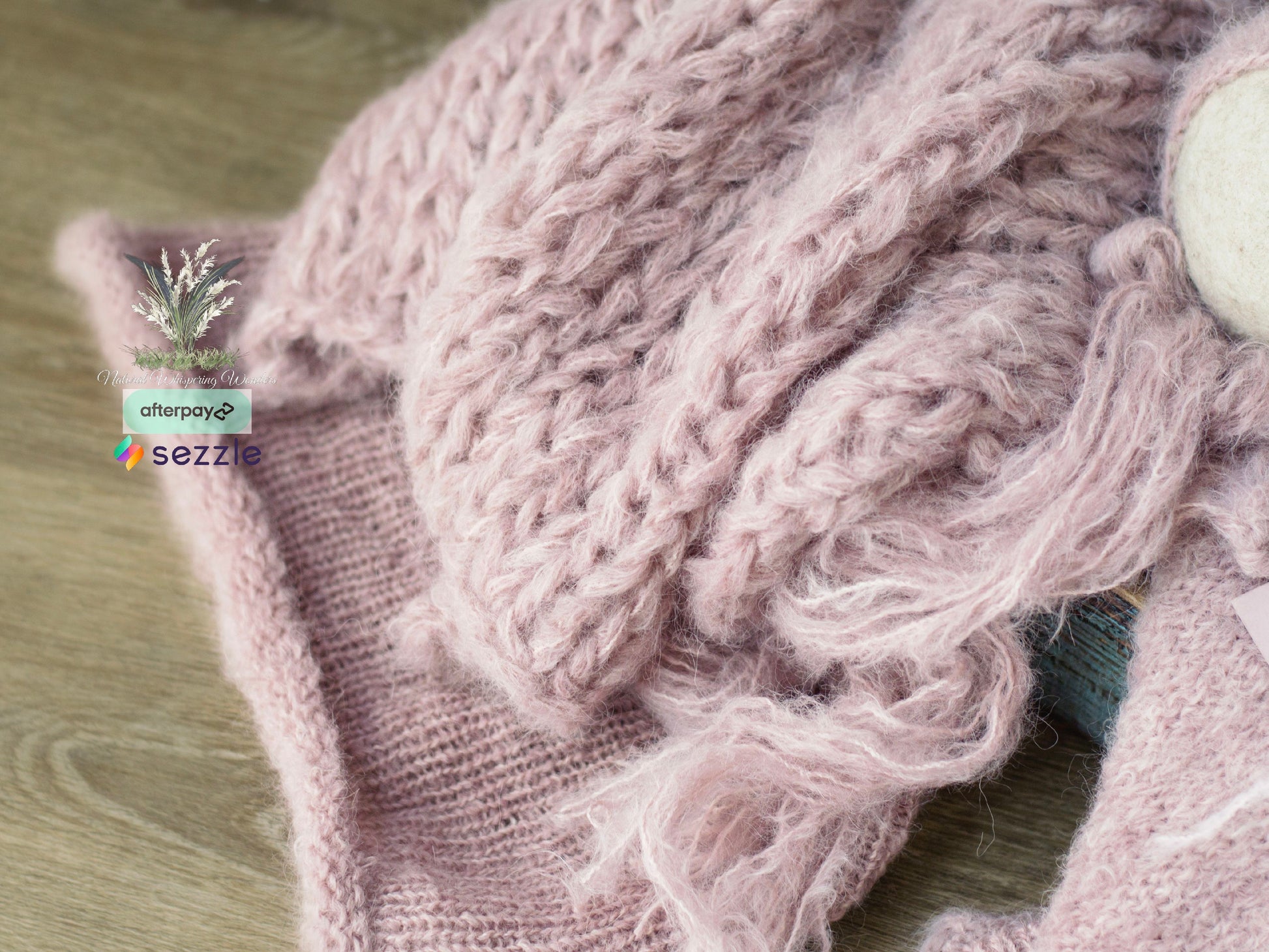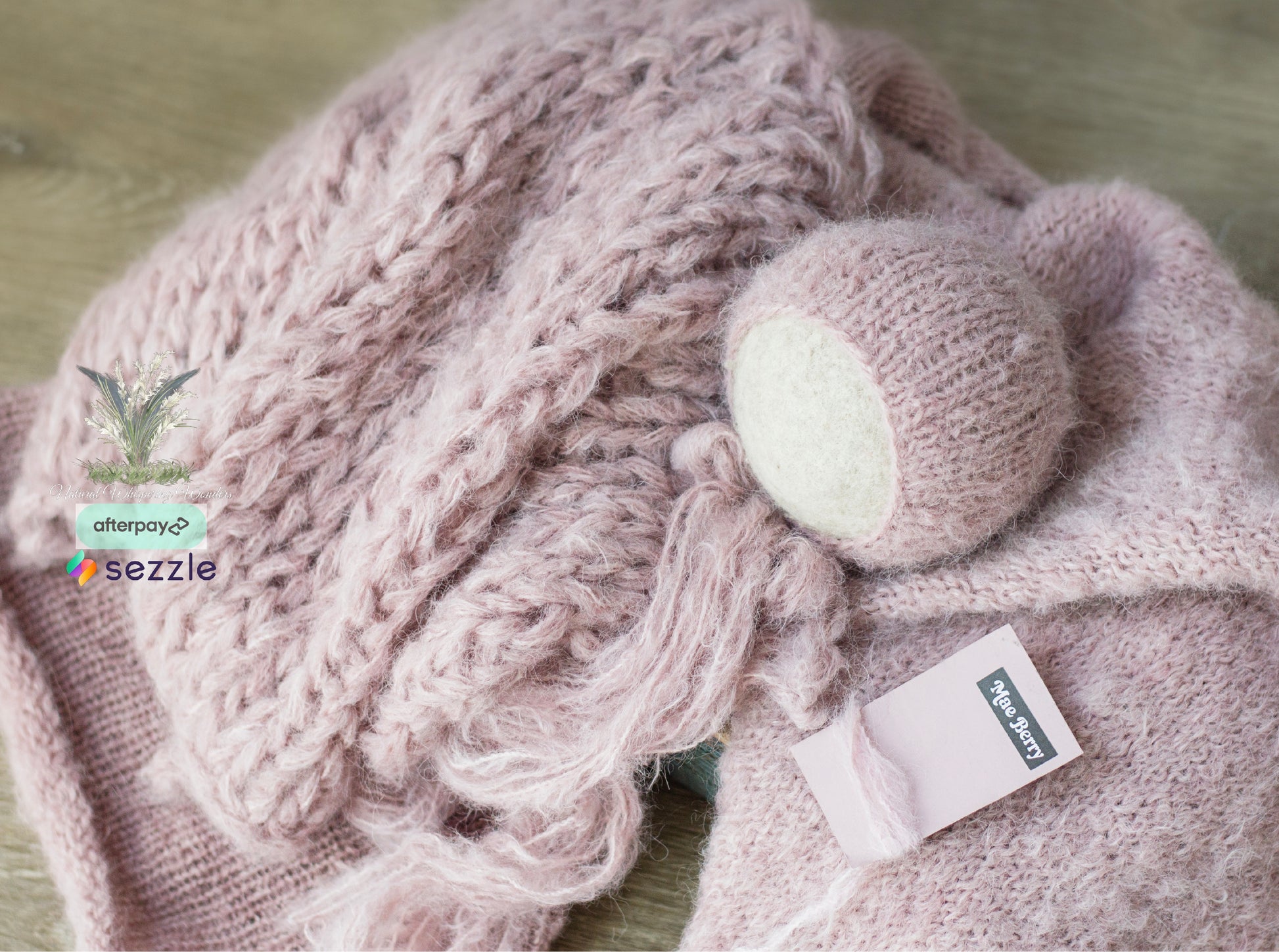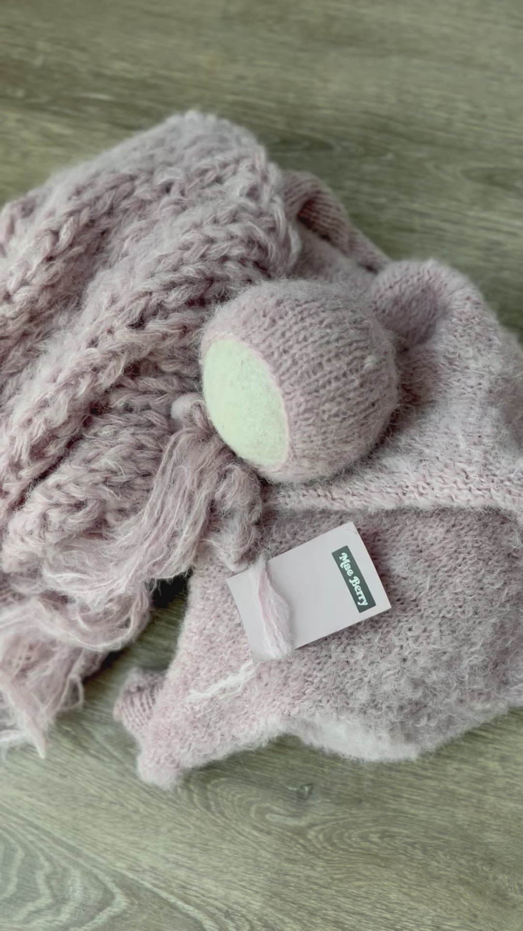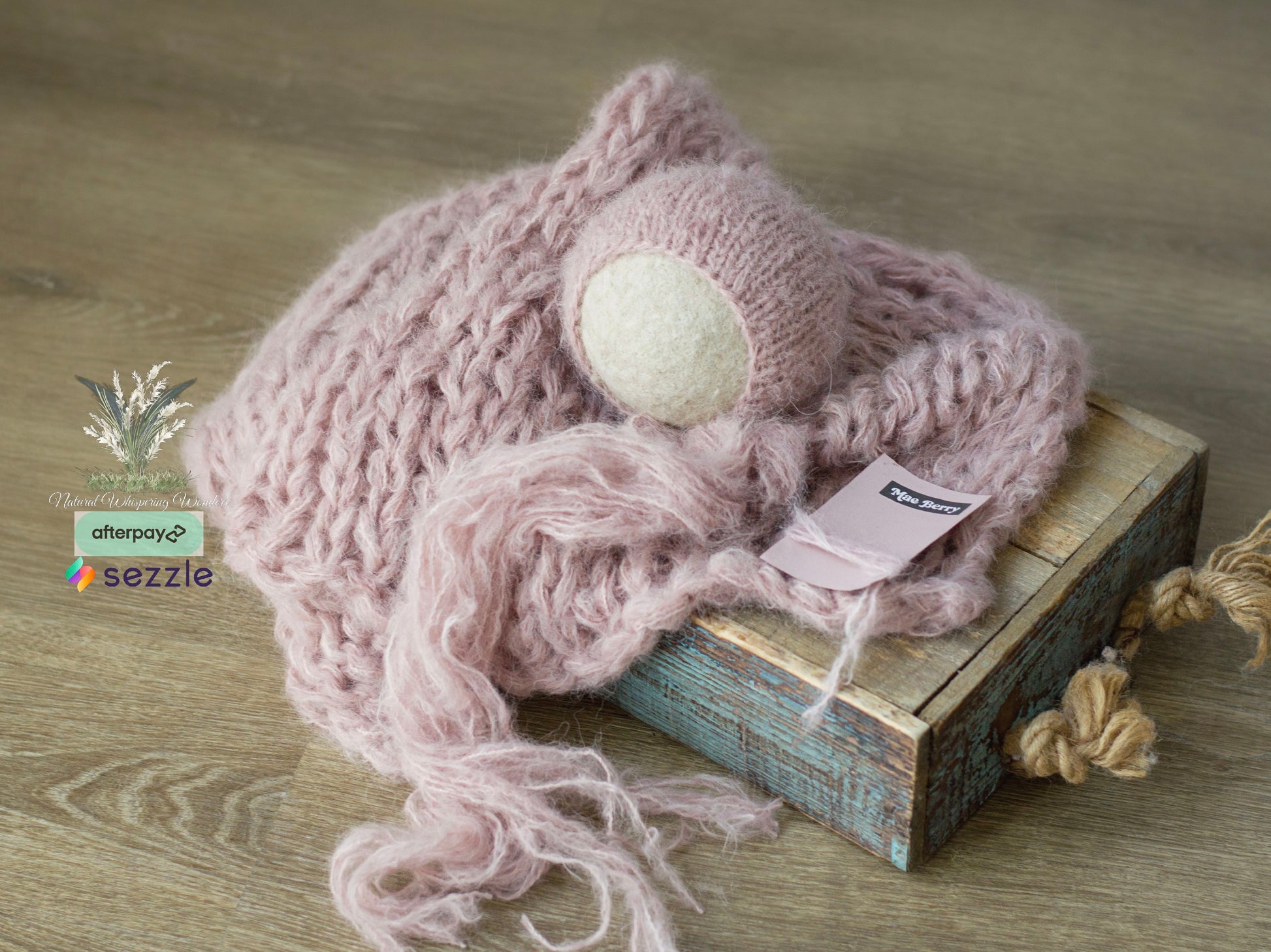 This is gorgeously hand knit with hand dyed brushed alpaca. 70” plus stretch. Great match for newborn nerds Maeberry. This set includes a layer, wrap and bonnet.