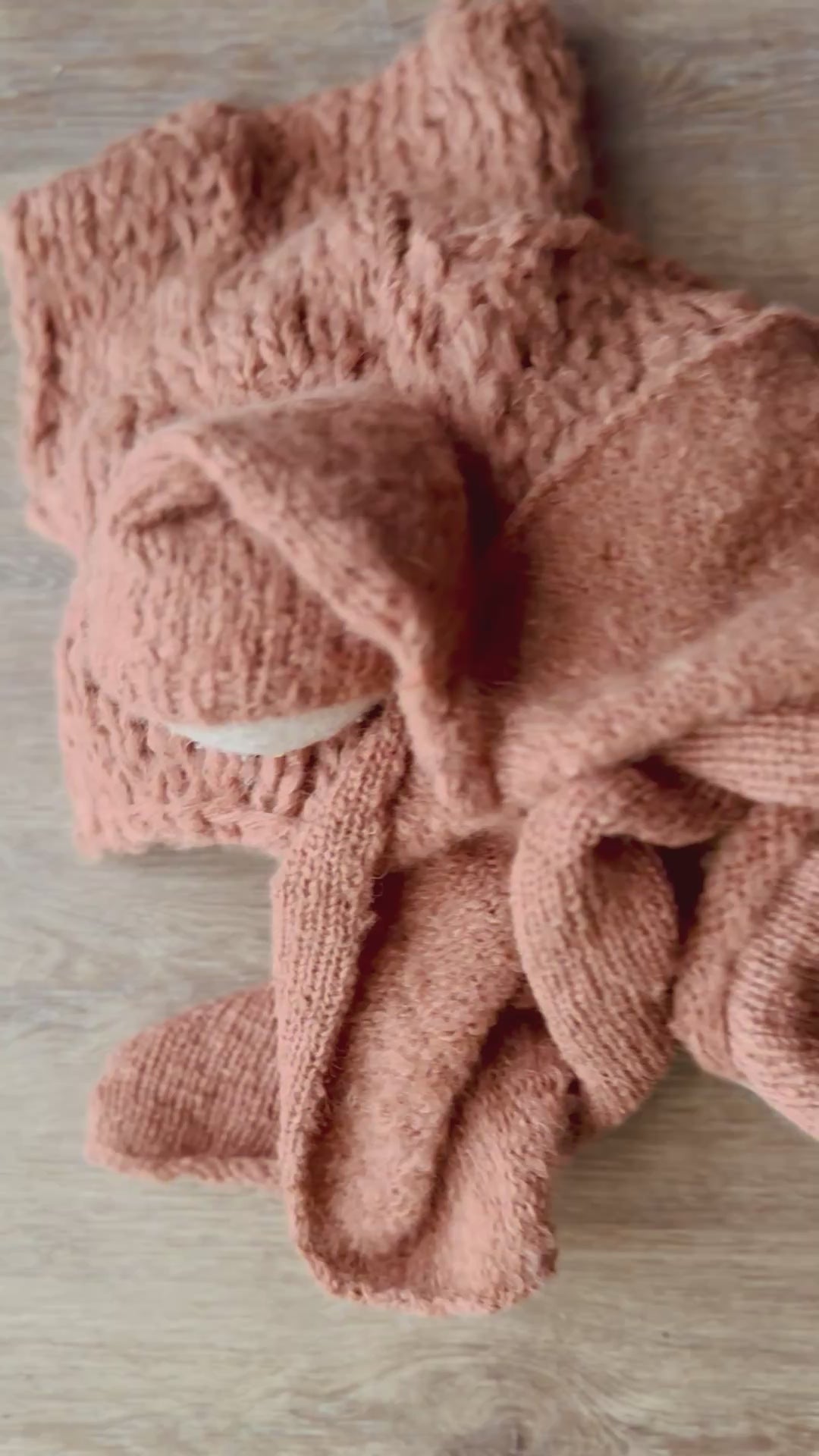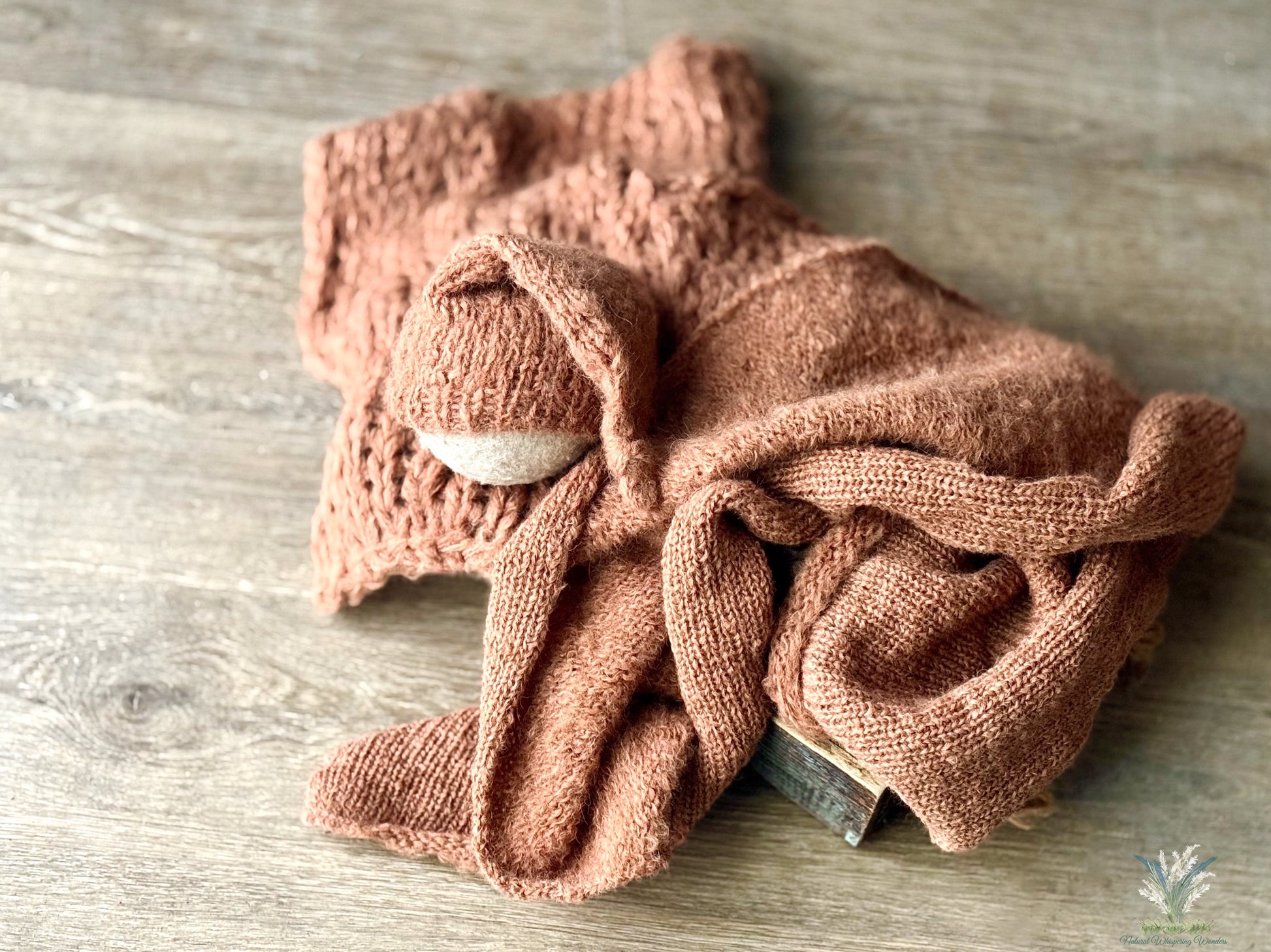 This is gorgeously hand knit with hand dyed brushed alpaca. 70” plus stretch. Great match for newborn nerds Faded Henna. This set includes a layer, wrap and Sleepycap.