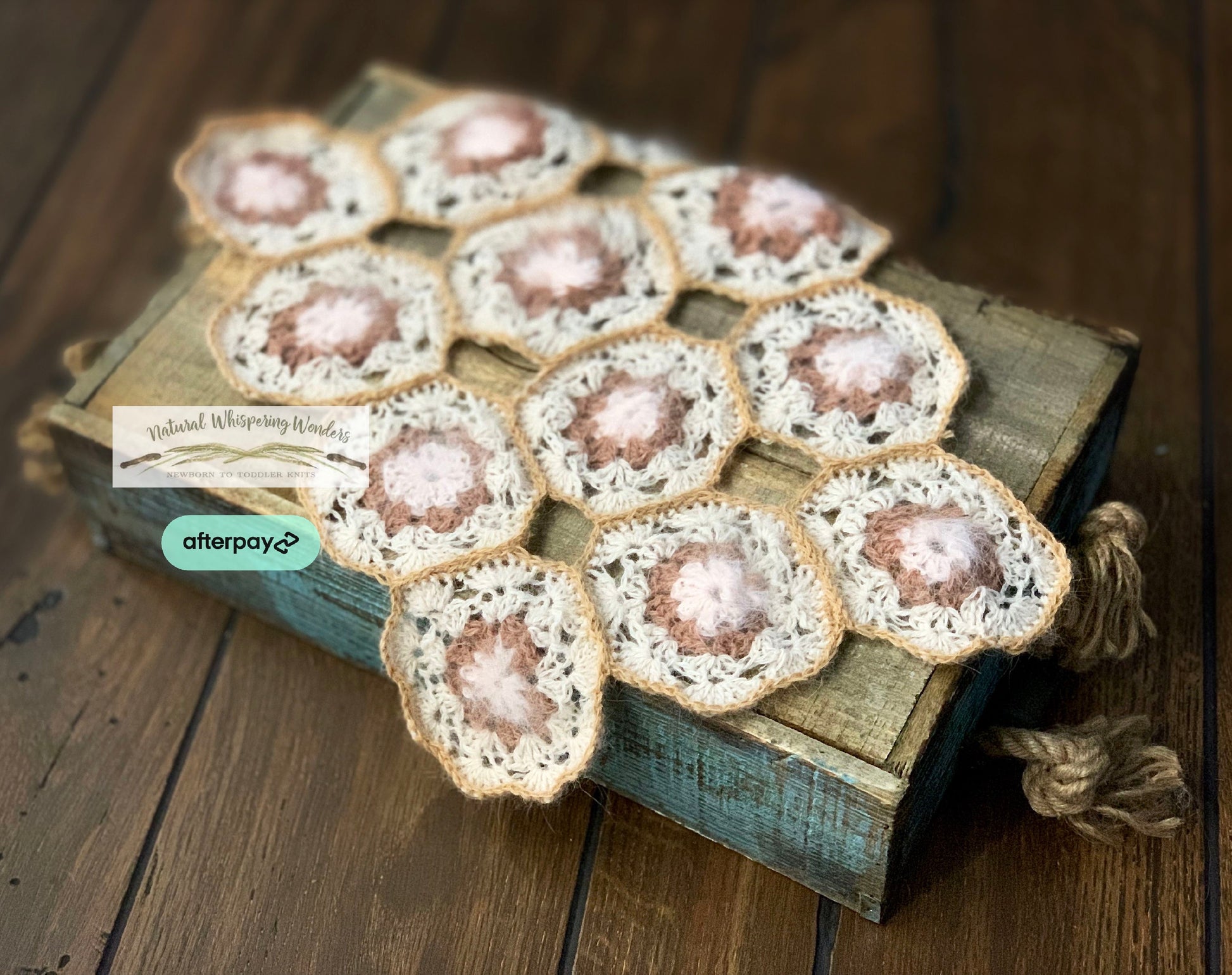 Hand crochet with gorgeous angora in pink, antique, cream and tan boarder. Works beautifully as a layer, stuffer in a bucket/basket, as a mat for sitters…so many opportunities.