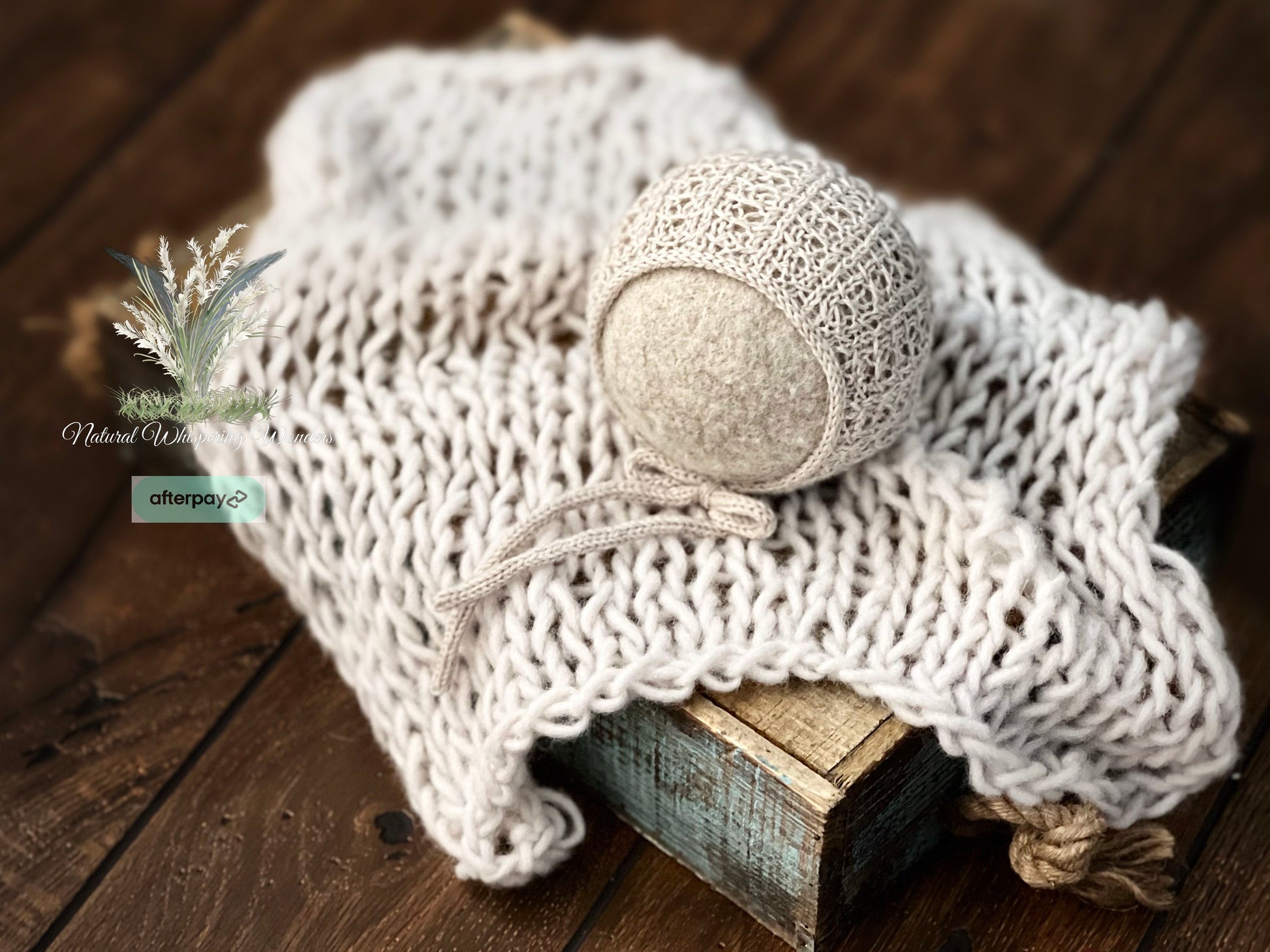 Hand knit with merino with this lovely texture stitch. This has icord ties for a finished look