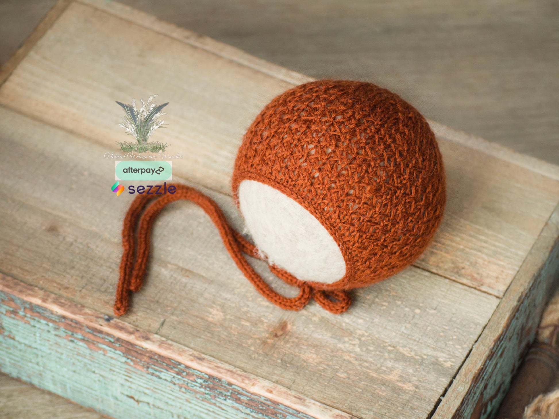 This beautiful bonnet is hand knit with merino in this gorgeous dark rusty tone. Very soft and stretchy.