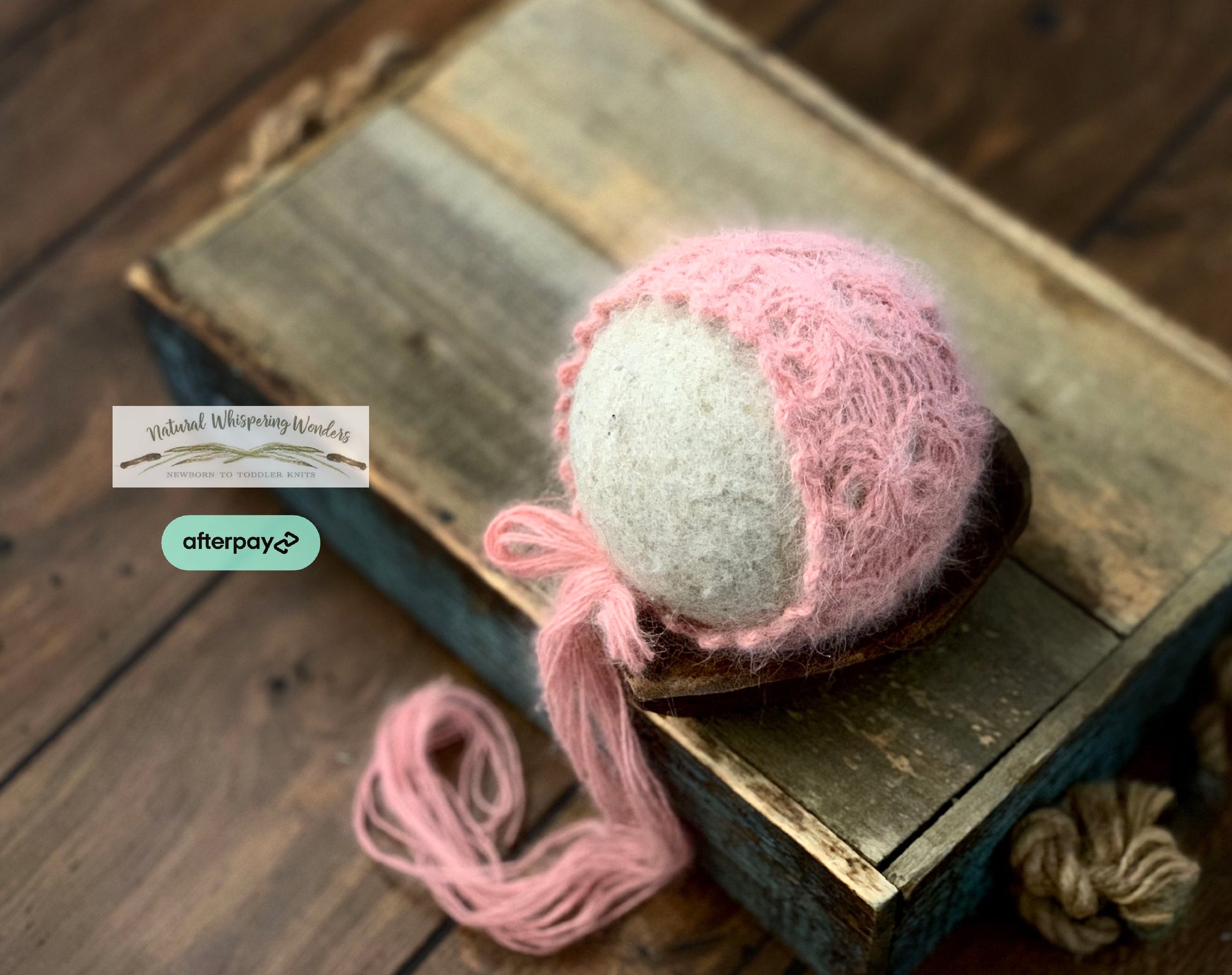 These are gorgeously hand knit with the fluffiest French angora. The bonnet has a lacy knit stitch to add a feminine touch.