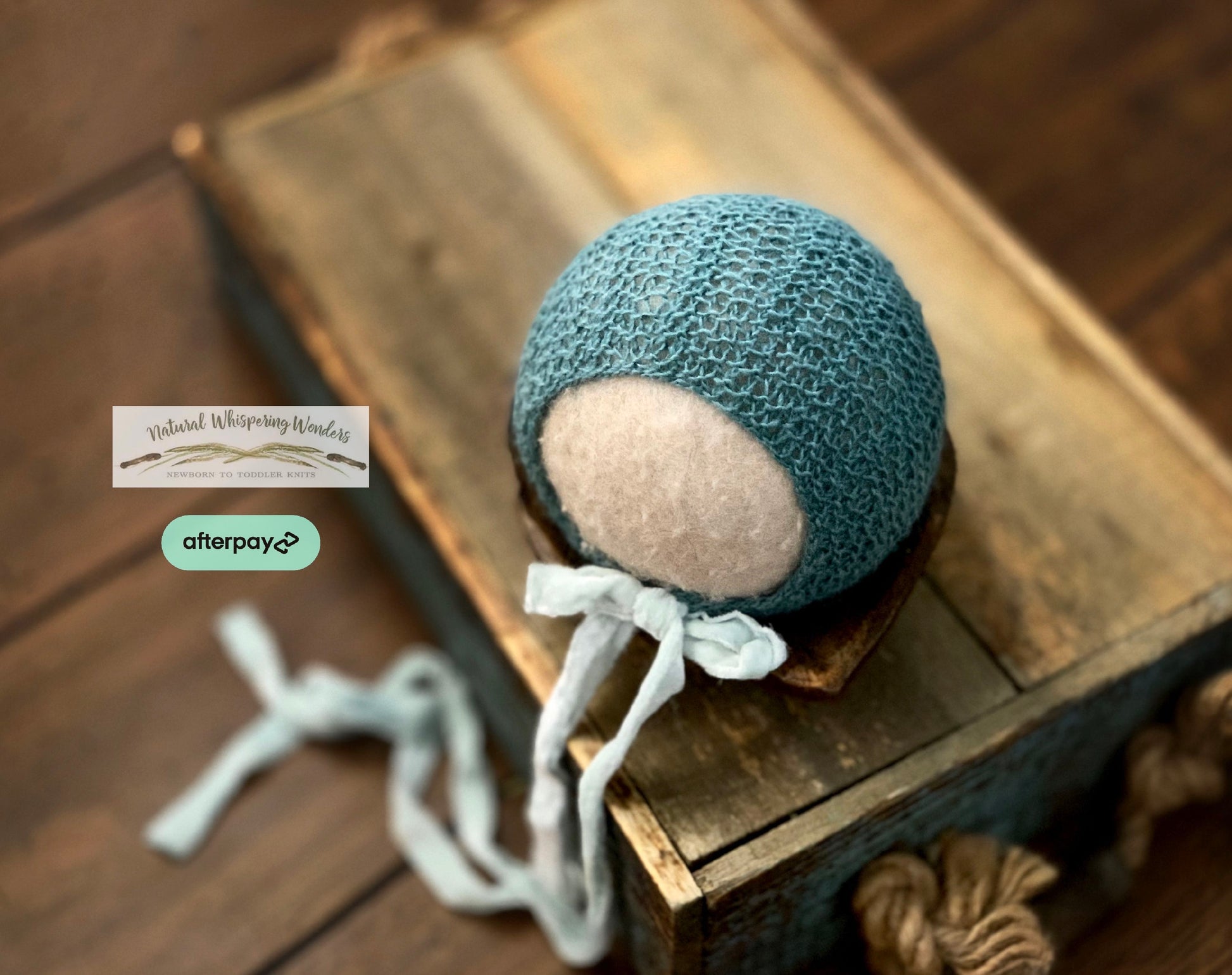 Hand knit with merino. In this gorgeous seaish blue colour. I love this textured stitch as stretchy too. You have a choice of hand dyed silk ties or velvet.