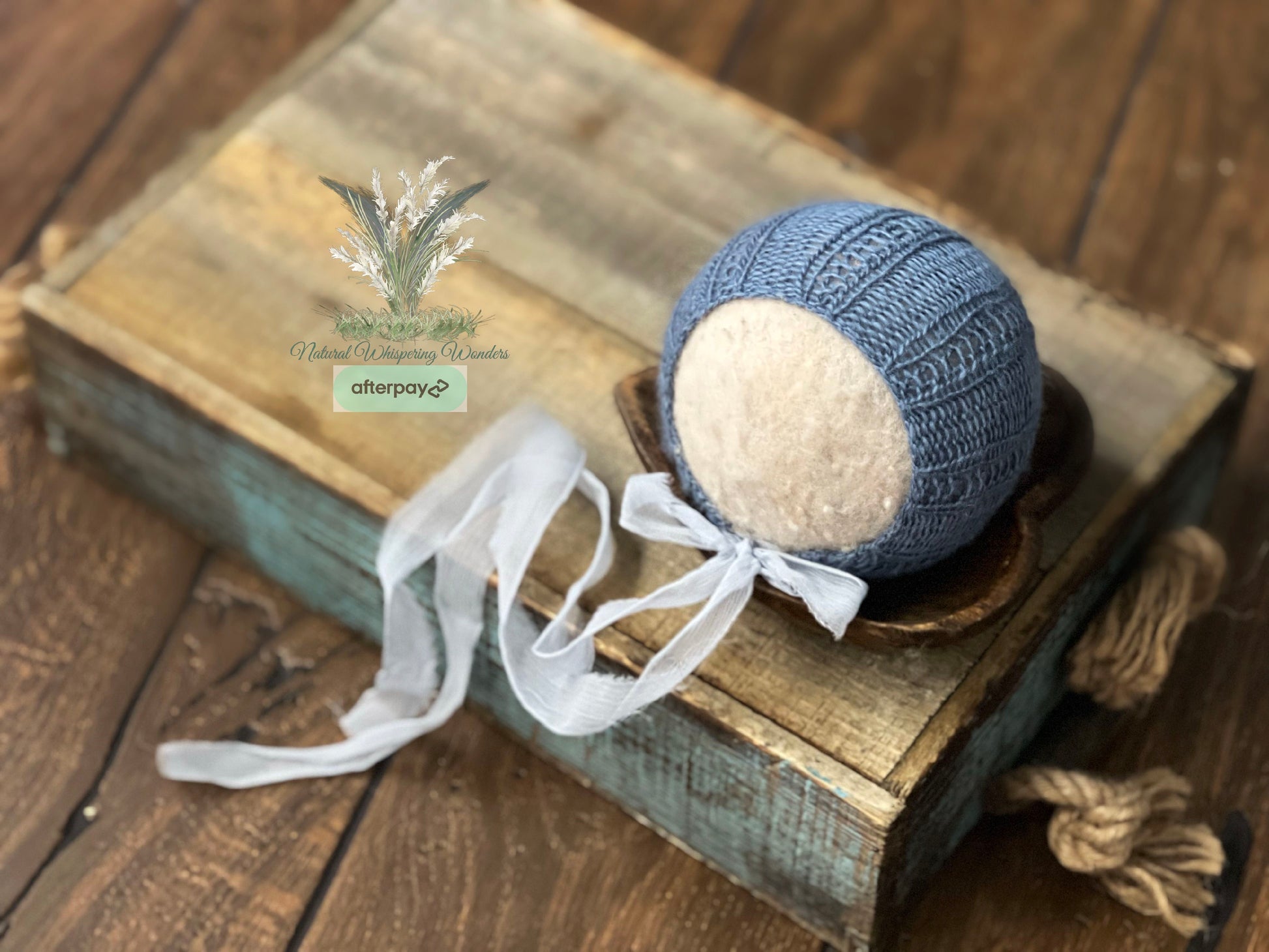 Hand knit with this gorgeous blue merino. So soft and smooth yarn that I’ve coordinated with this pretty chiffon ties. Has a loverly vertical knit stitch that is reversible.