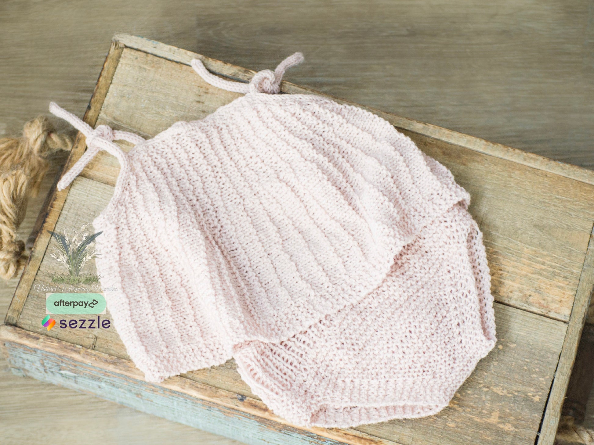 This is an adorable tank top. Very forgiving in size. Hand knit with organic merino. This tank top has adjustable straps and this beautifully textured stripe effect around this top. It fits any newborn size as it is very flowy. Also has fitting bloomer weird a bit of texture and stretchy waist.