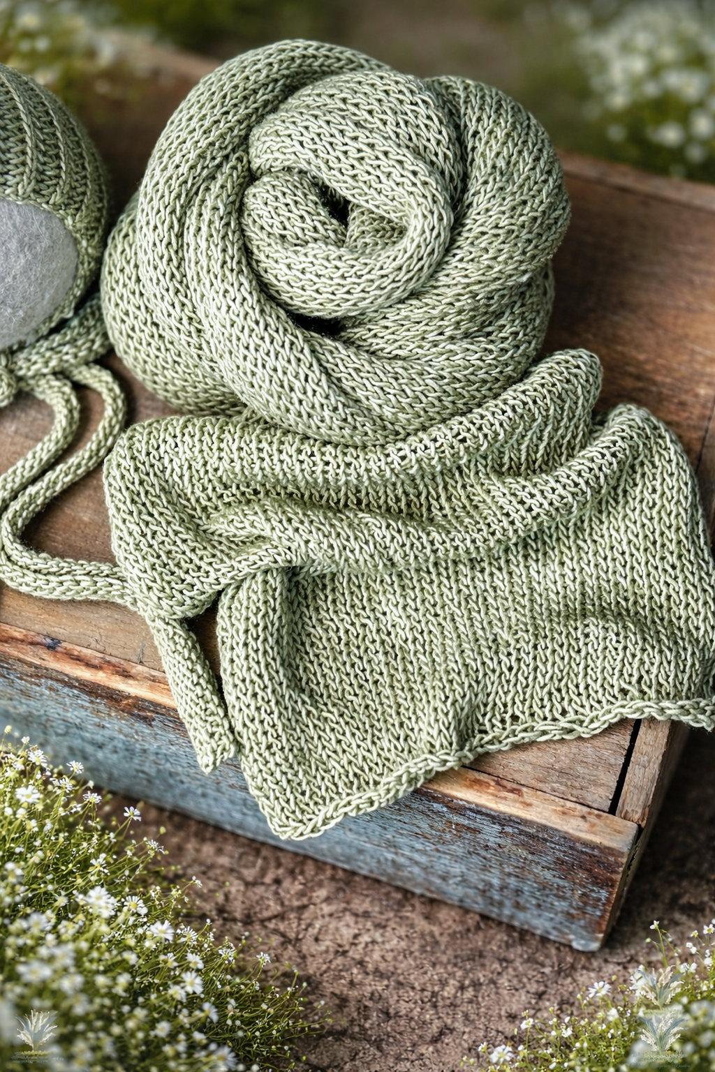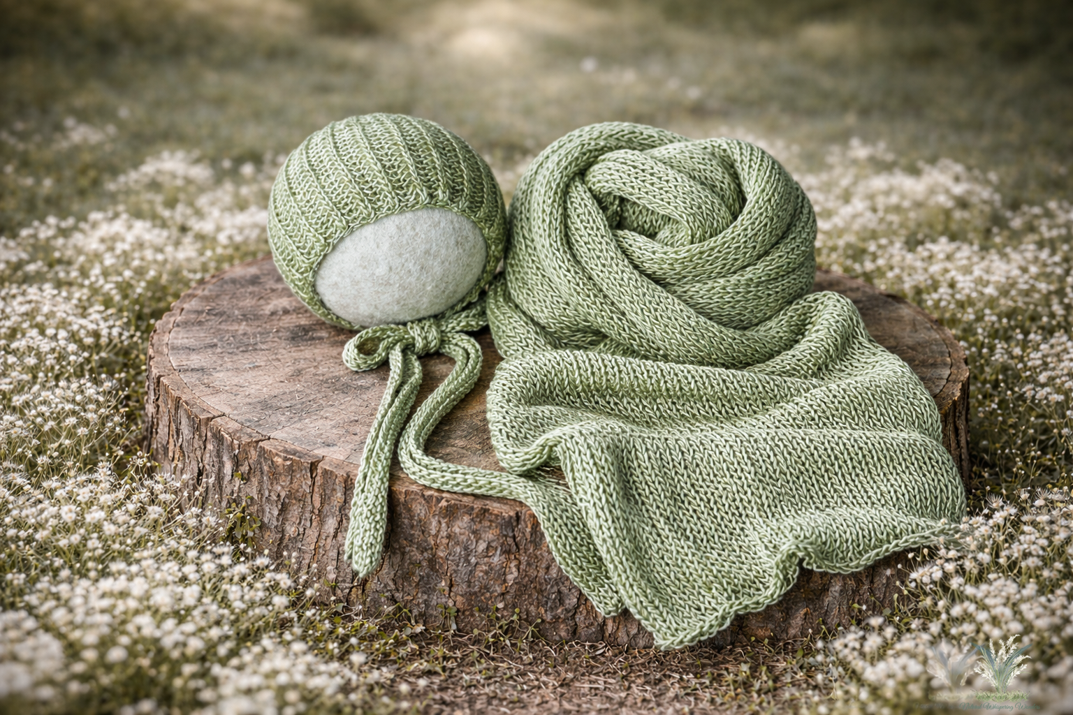 Wrap your little one in timeless charm with this hand dyed, hand knit wrap and bonnet set lovingly crafted for newborn photography.