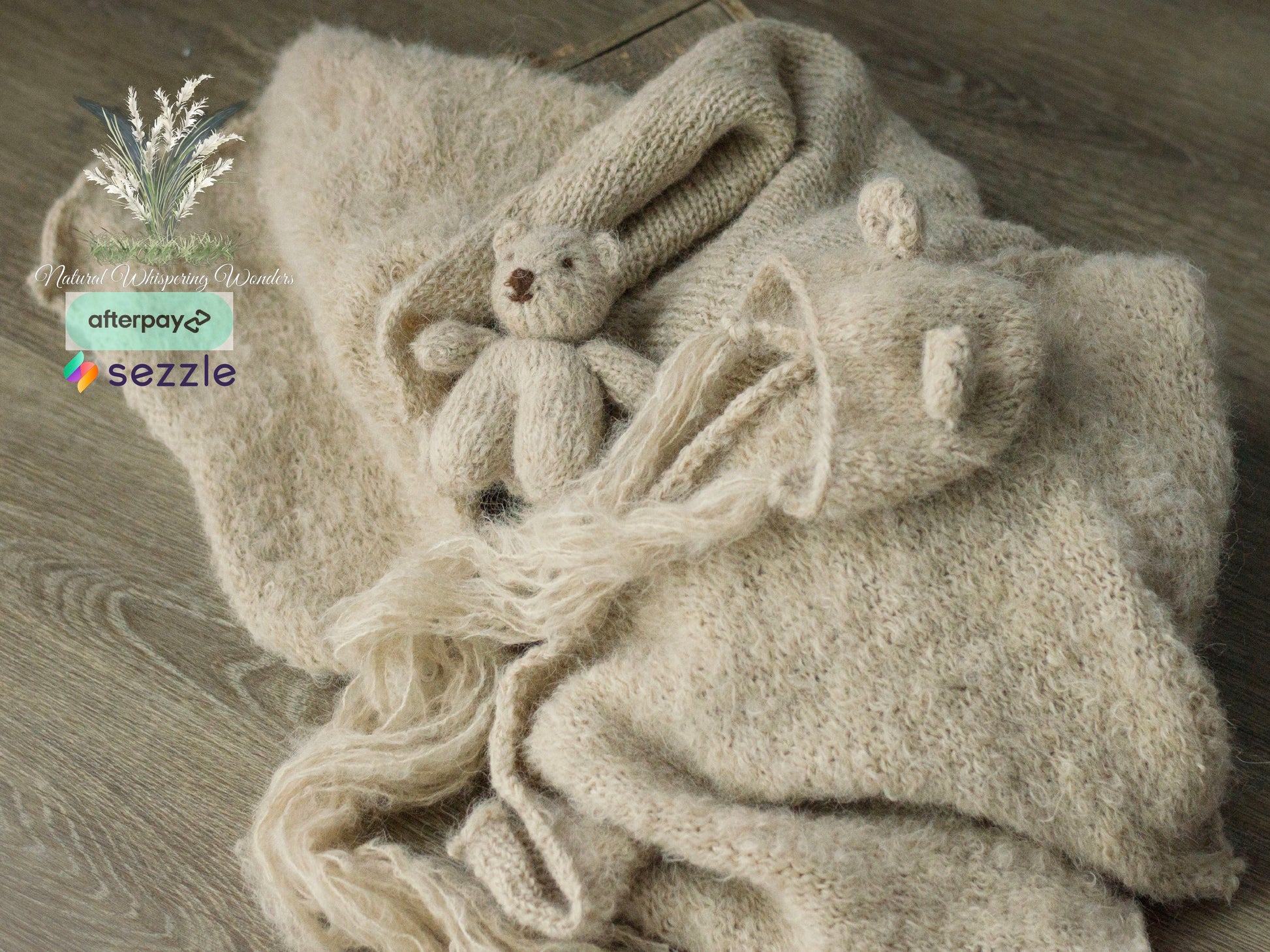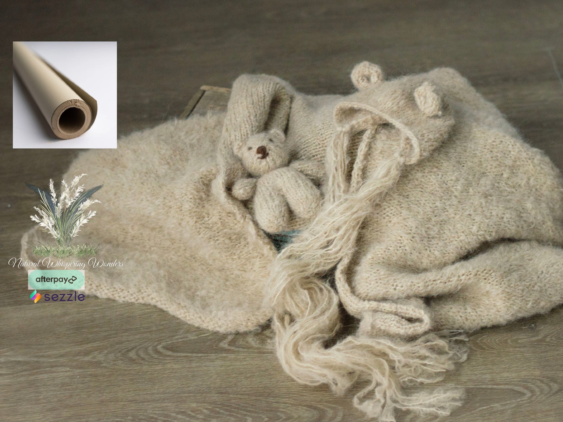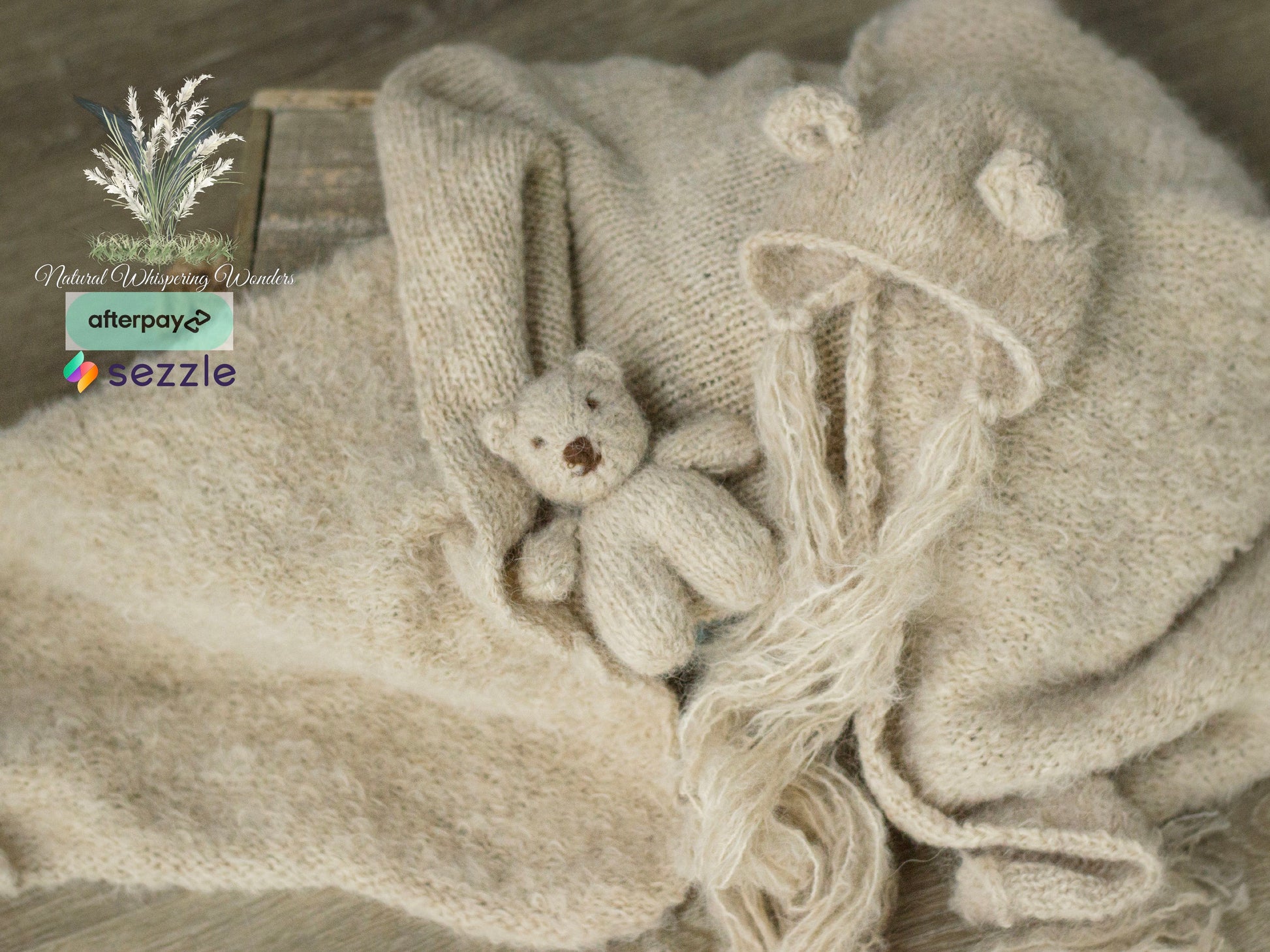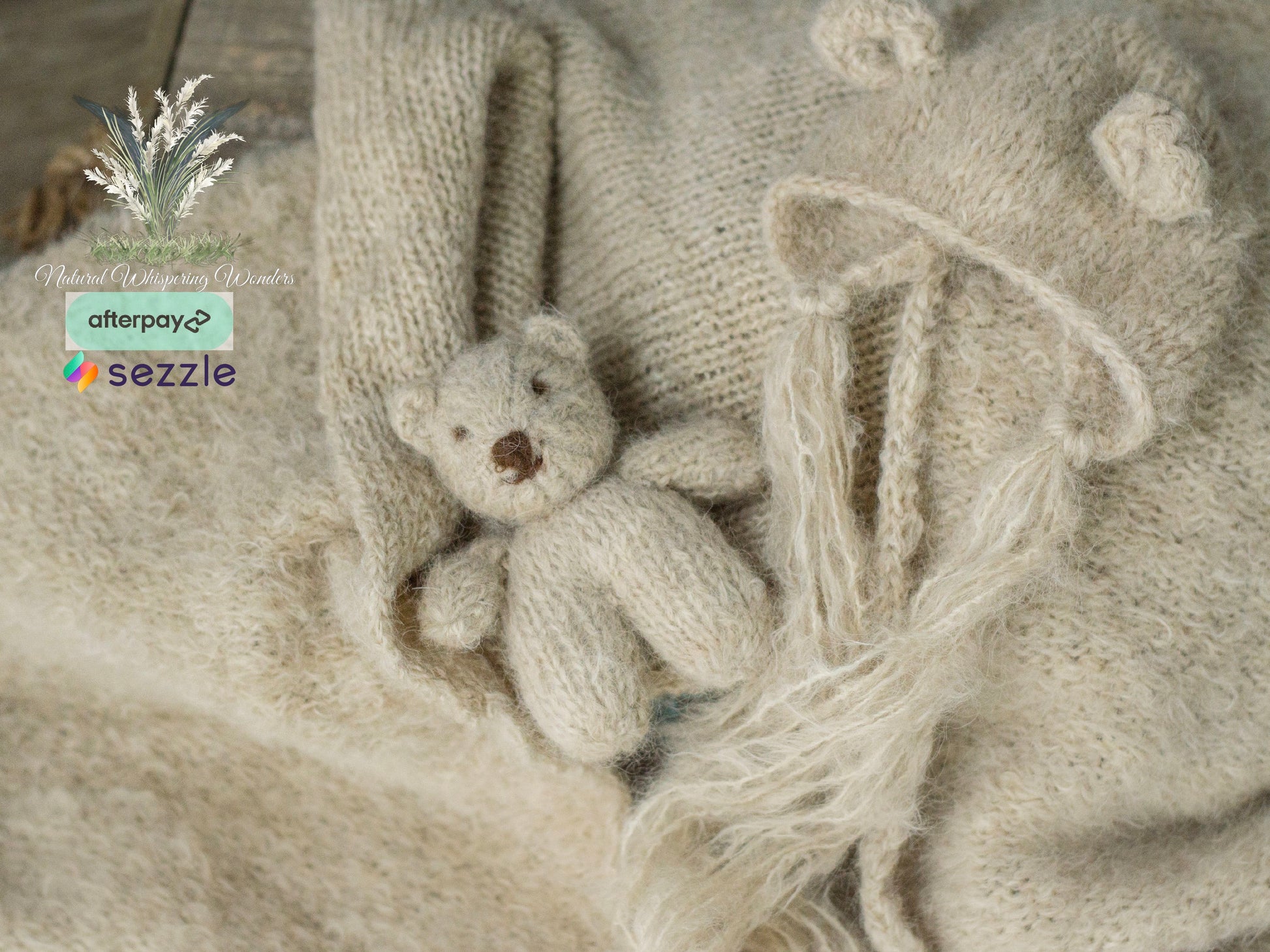 This is gorgeously hand knit with hand dyed brushed alpaca. 70” plus stretch. Great match for newborn nerds Nubuck. The sets includes wrap, bear bonnet and Bear Lovie. Pick and choose to make it a full set or as separates.