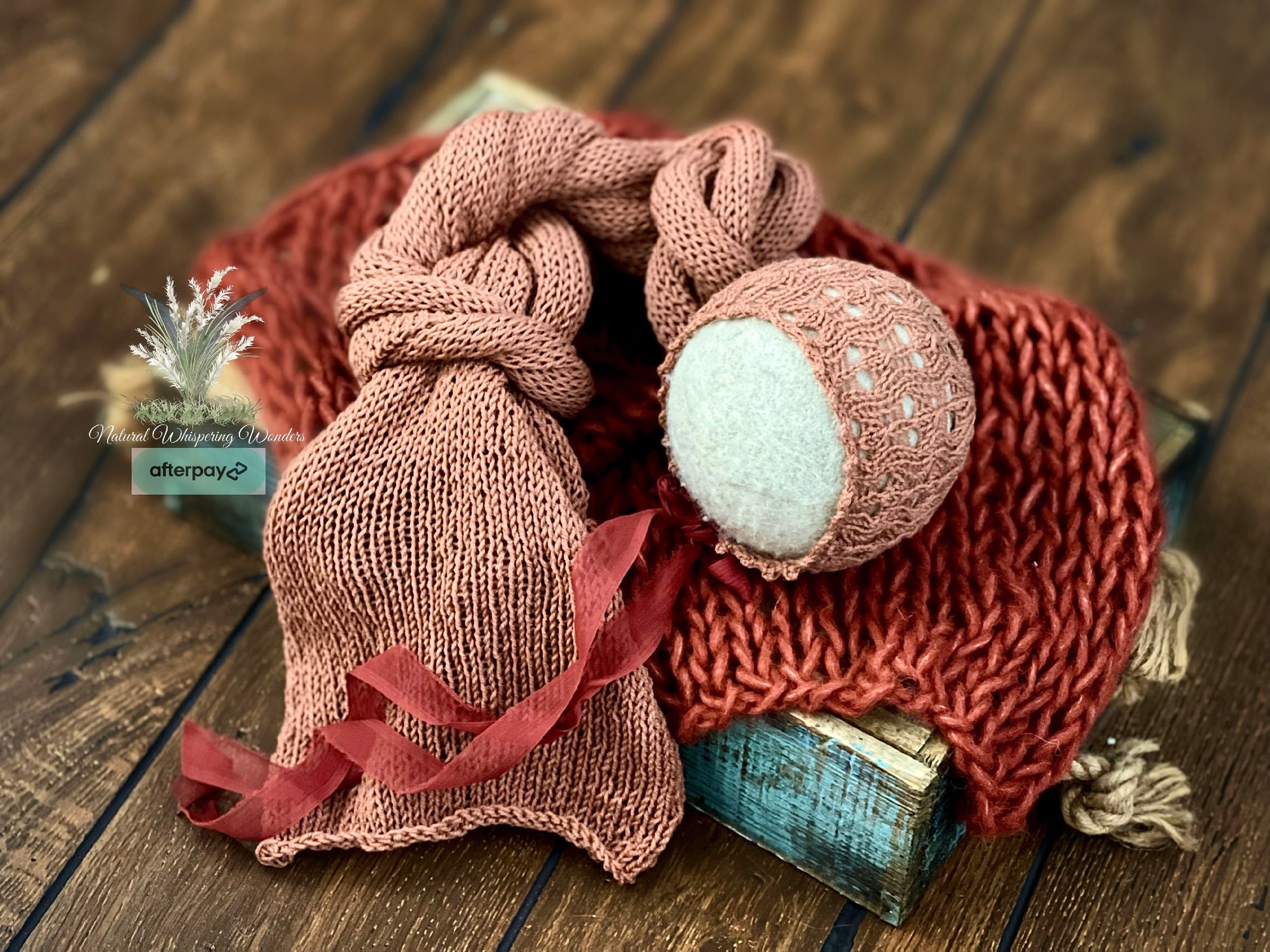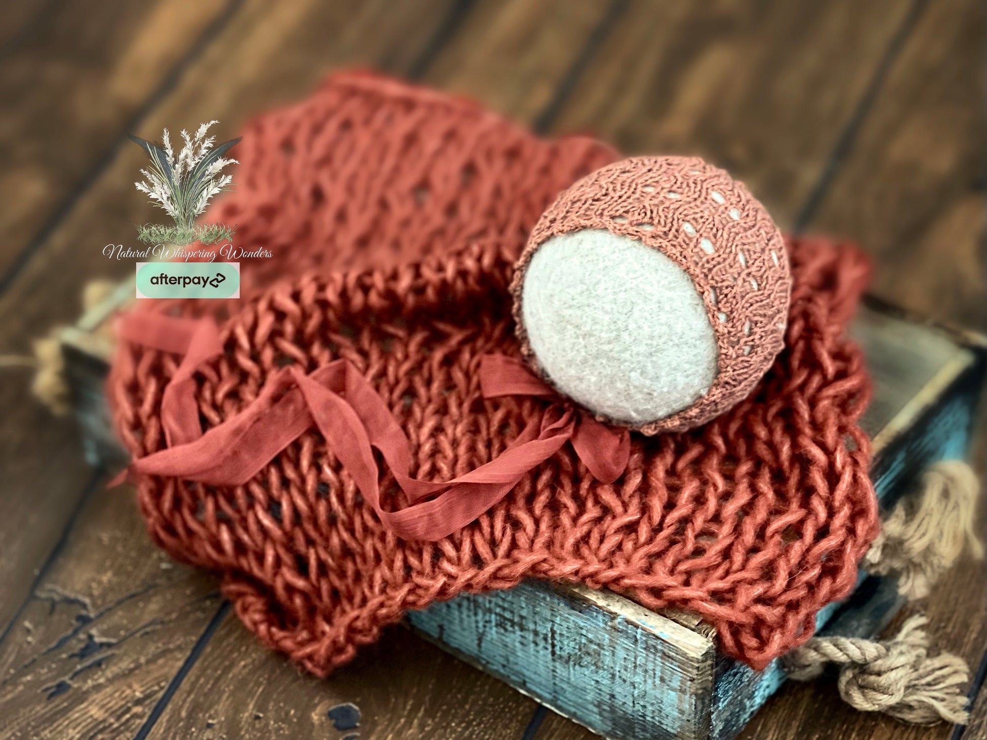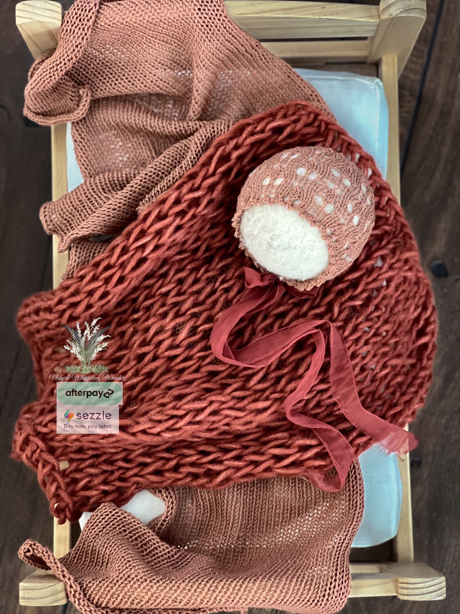 This set is hand knit with merino for the bonnet with coordinating chiffon ties. The bonnet has this beautiful lacy knit throughout. The layer is aprox 19” and hand knit witch a brushed alpaca + merino. Wrap is aprox 12”x70” plus stretch. This set is just gorgeous together.