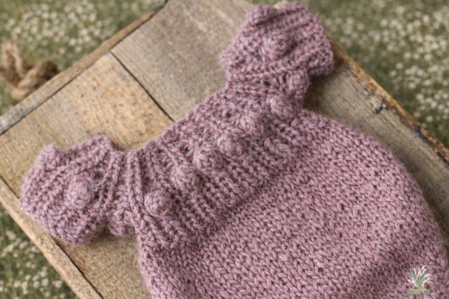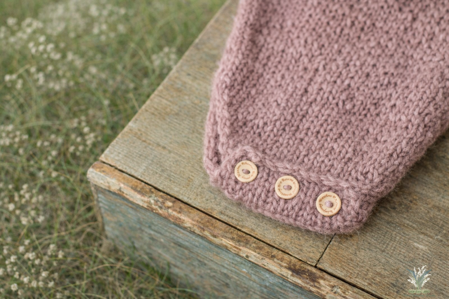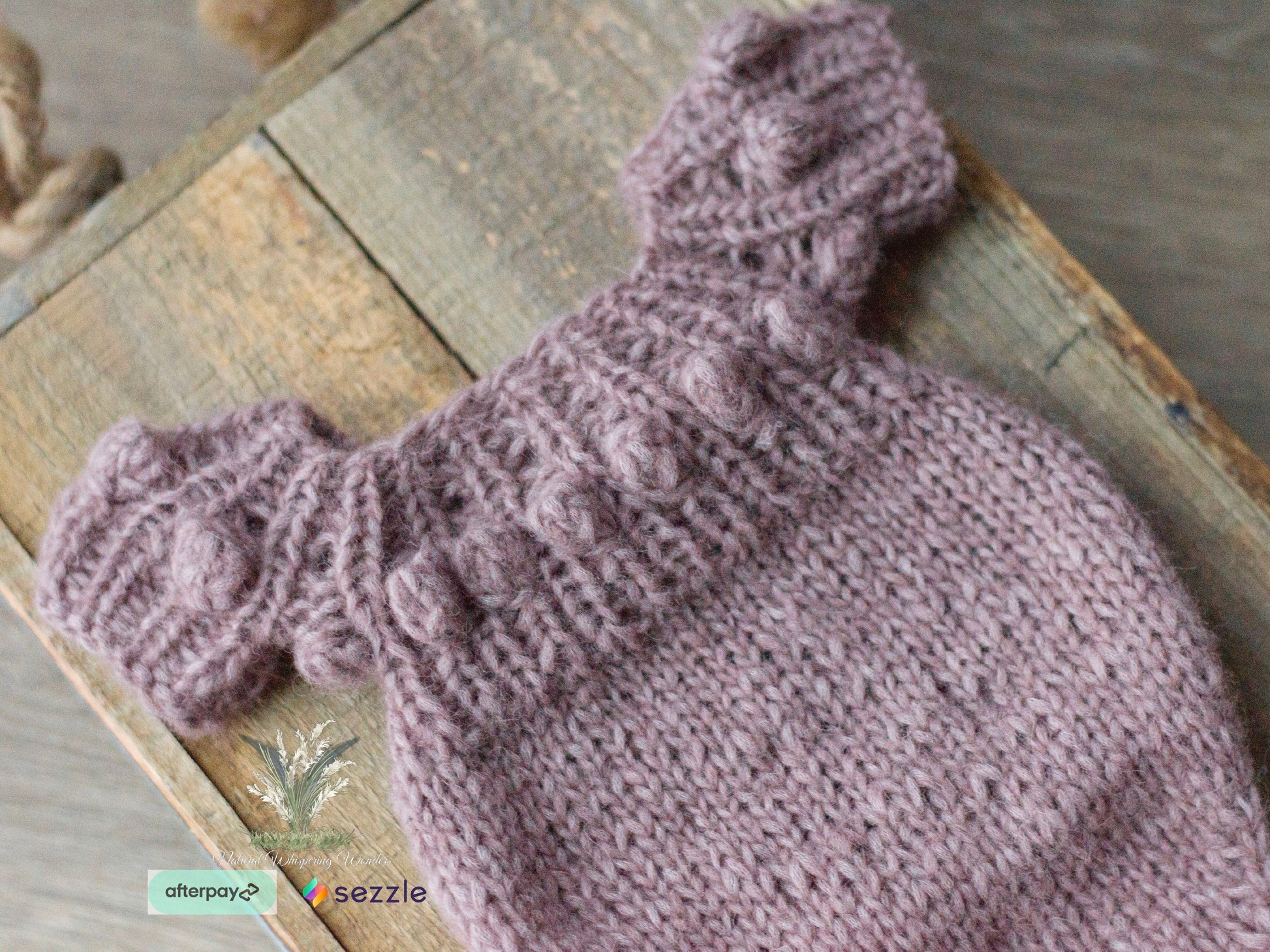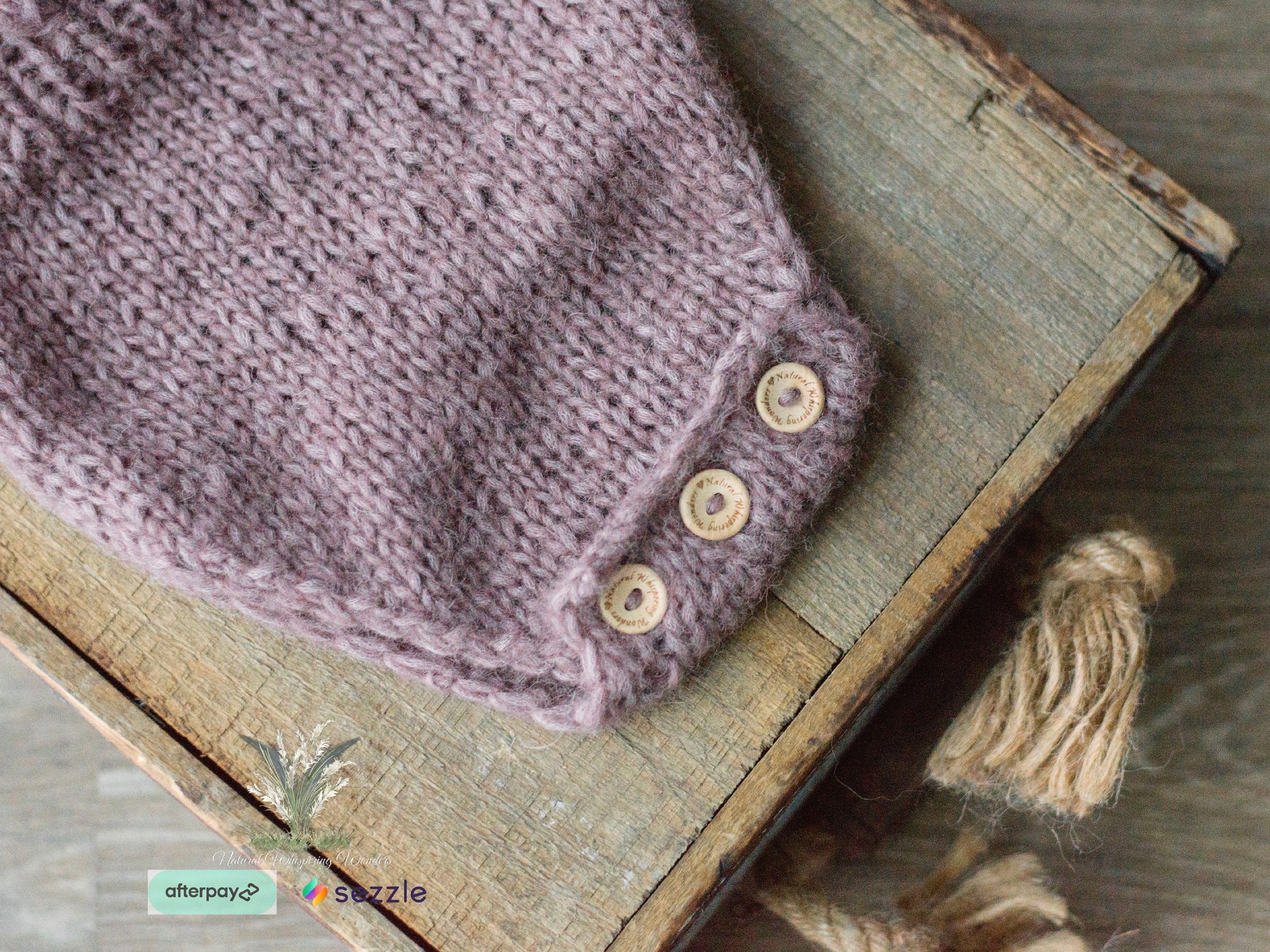 This beautiful romper was hand knit with brushed alpaca. It’s a gorgeous dusty mauve colour. Has buttons at the bottom for easy dressing.