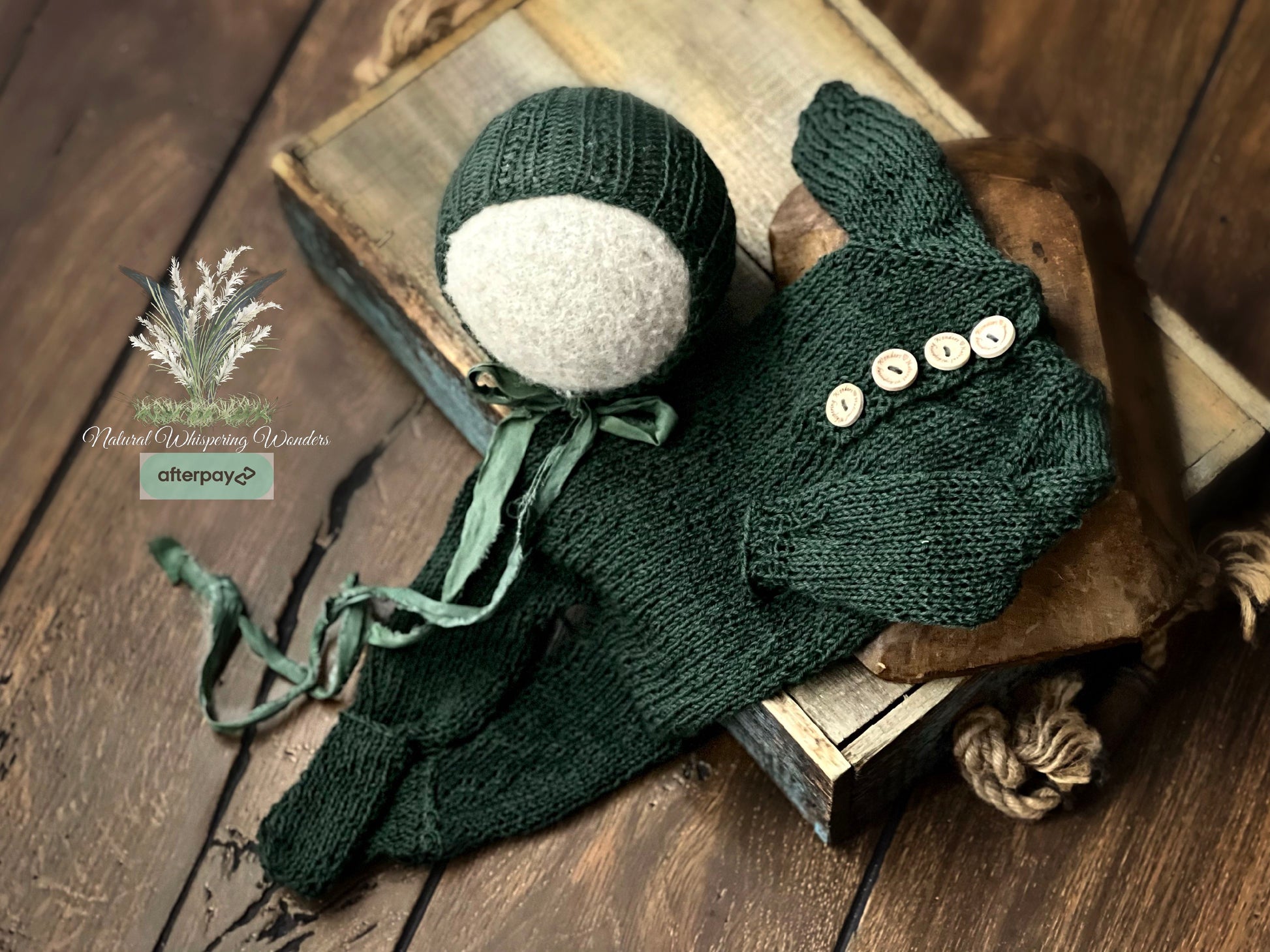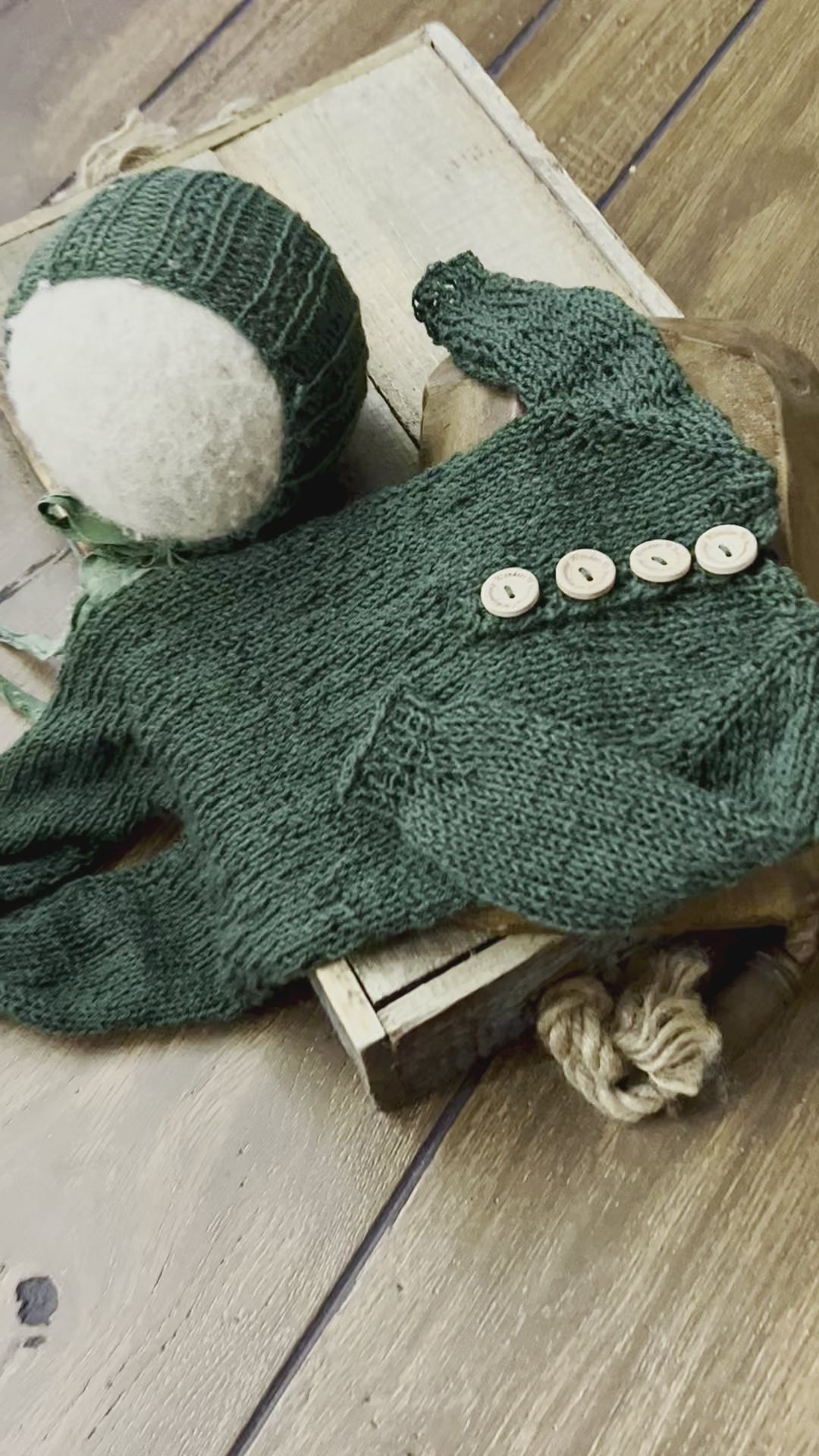 Hand knit with organic merino. This is soft and slightly textured yarn. Such a beautiful green shade. Like all of our Signature Sets. It comes with fold over footed pockets. You can choose to show off those or not.
