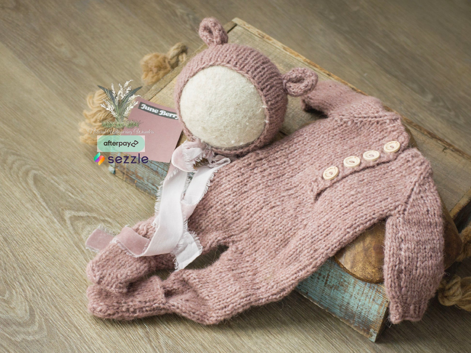 Hand knit with brushed alpaca. This is super soft and sligjr halo, sleeper and bear bonnet set for newborns. The bear bonnet has velvet ties. All signature outfits come with fold over footed pockets. You can choose to hide those feet or not. This is a good match for Buttered Cow for Newborn Nerds.