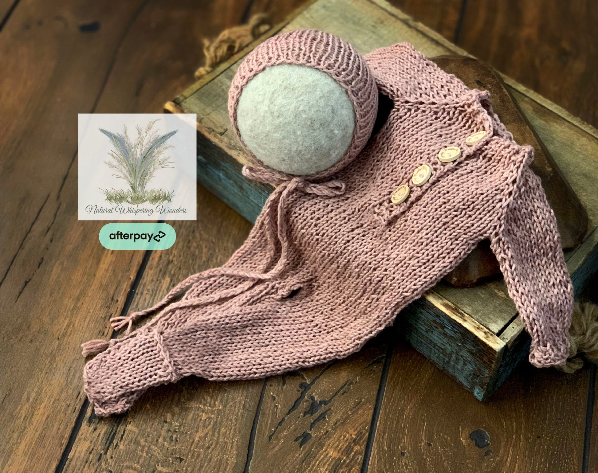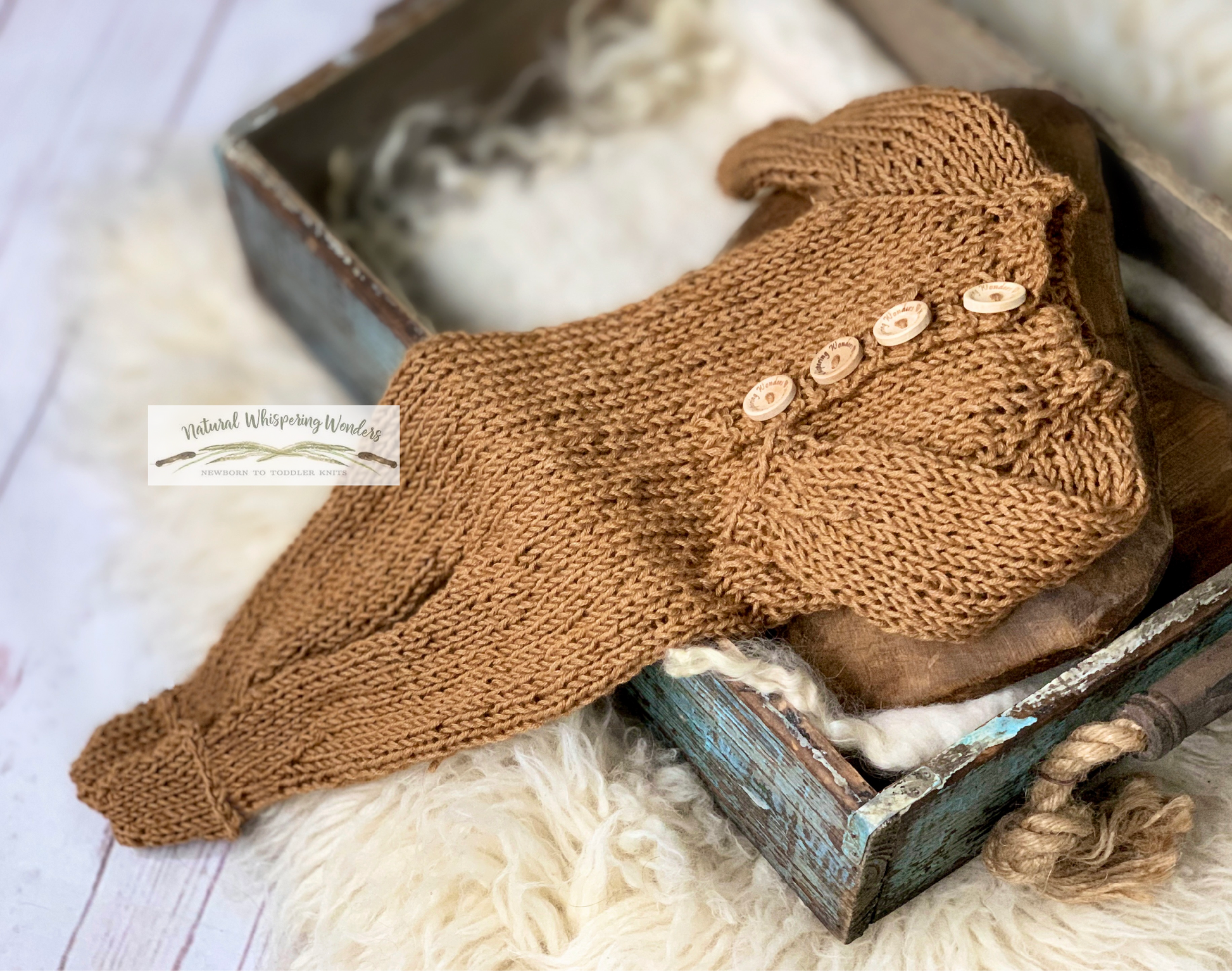 Hand knit with a soft brushed cotton blend. Like all of the signature pieces it comes with fold over footed pockets. You can choose to show off those feet or not. You have a choose of bonnet or sleepy cap.