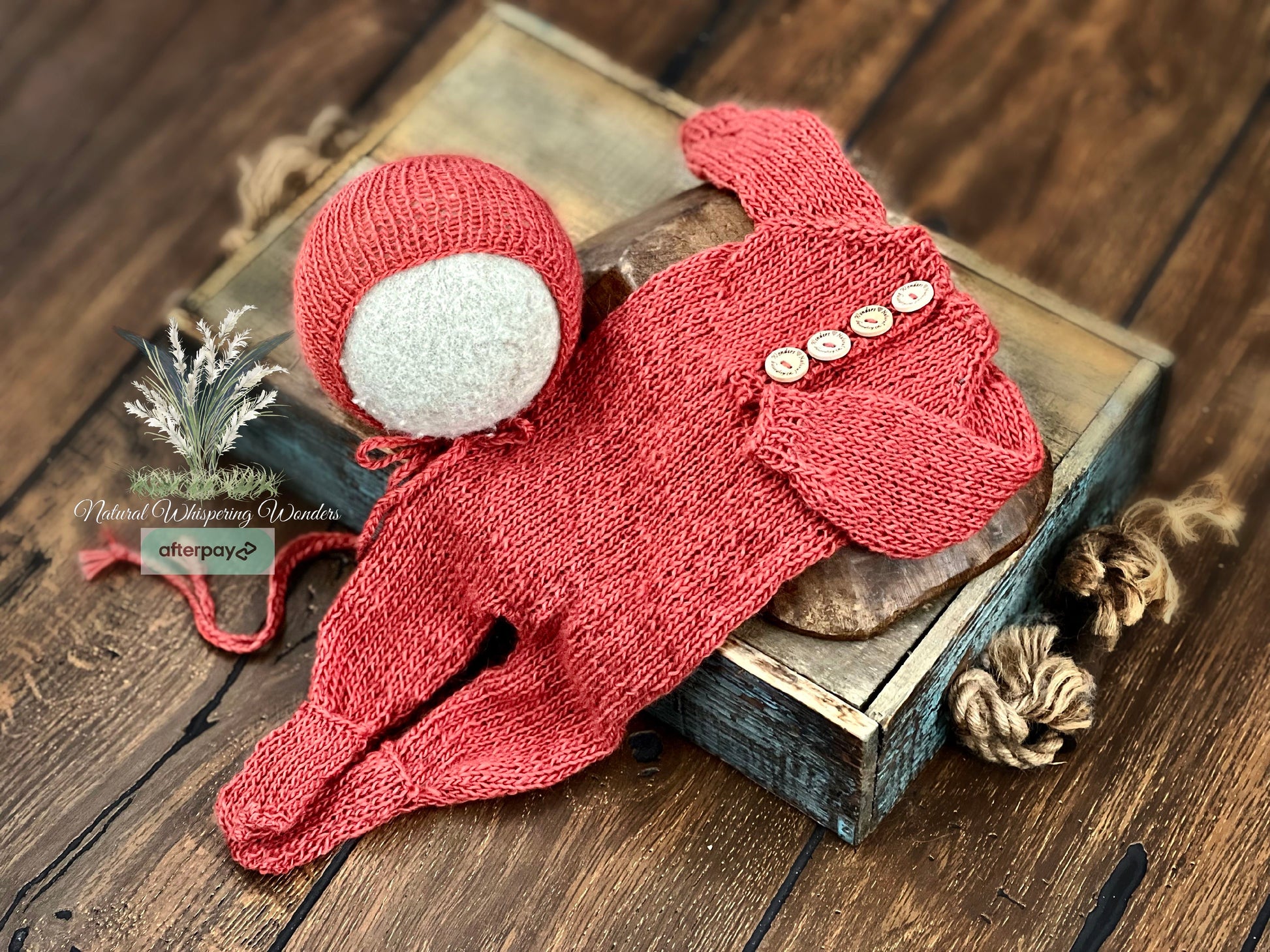 This is hand knit with super soft merino. This comes with a newborn bonnet. In such a gorgeous rusty red colour. Like all my Signature outfits. It comes with the fold over footed pockets. You can choose to show off those feet or not.