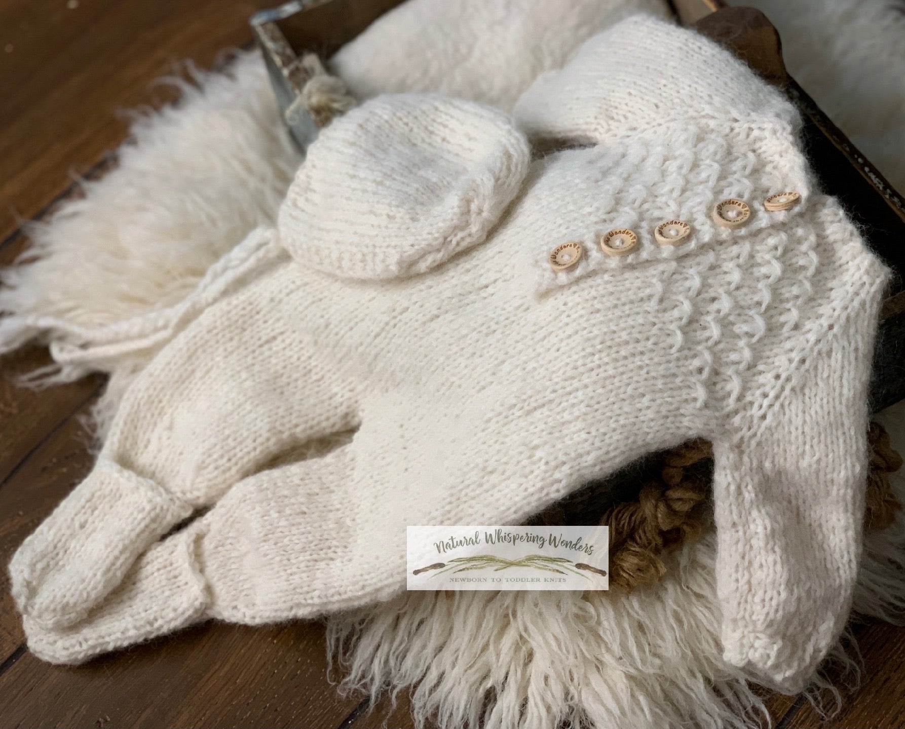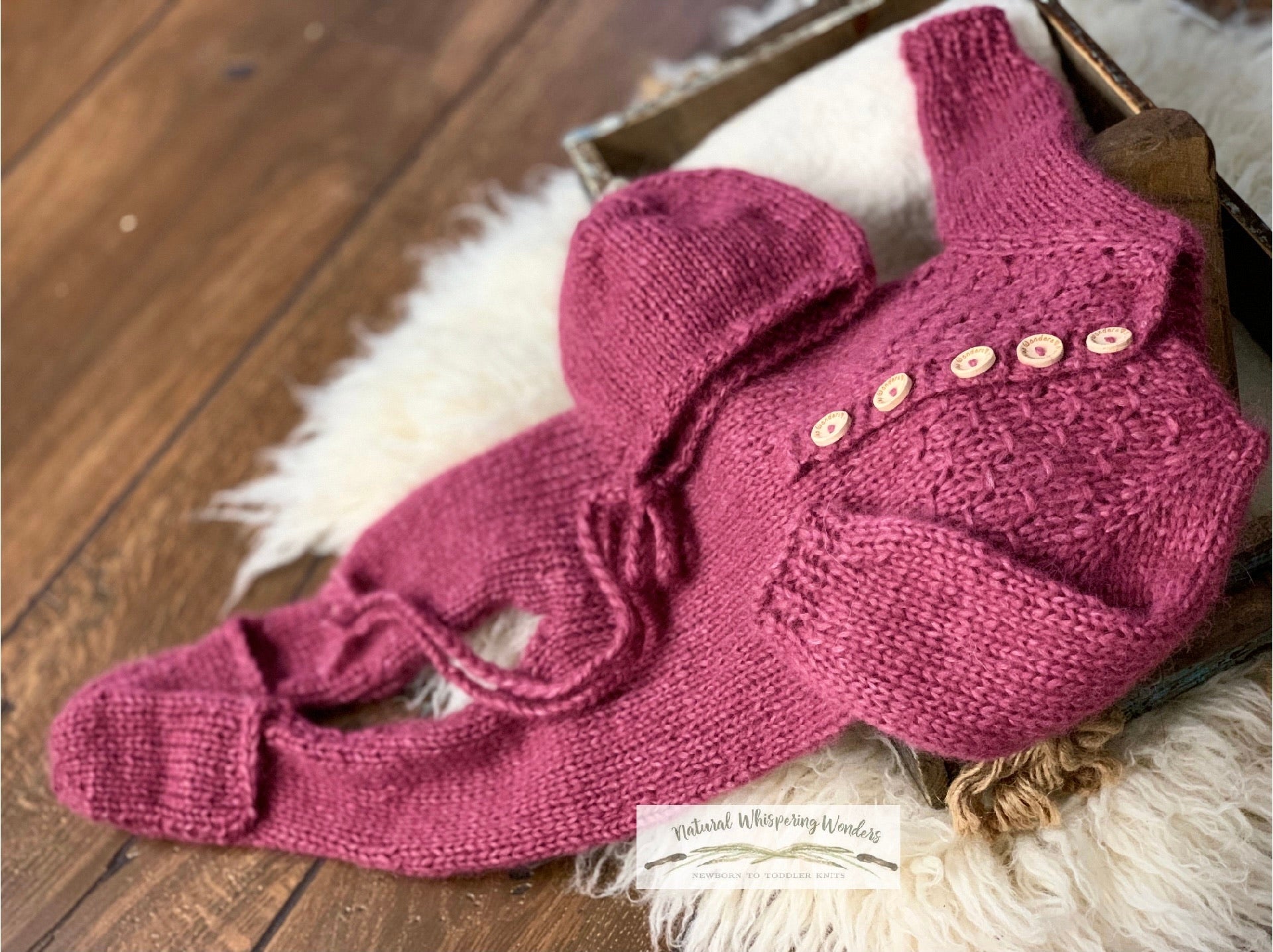 hand knit with brushed alpaca. This is perfect for covering up diapers. This also has a little detail at around the chest. All Signature pieces come with fold over footed pockets. You have the choice to hide the feet or not.