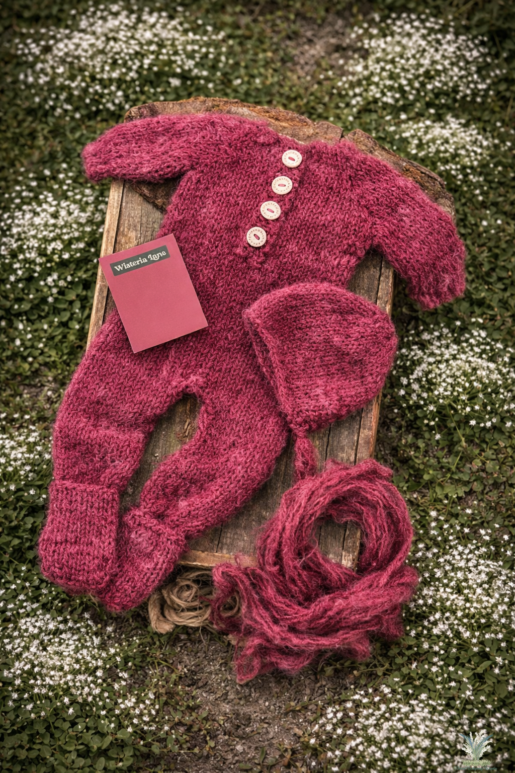 Hand knit with hand dyed brushed alpaca. This Signature Theo is similar to the Signature Bentley Sleeper set. With slightly thicker yarn and fluffier, with the same softness.