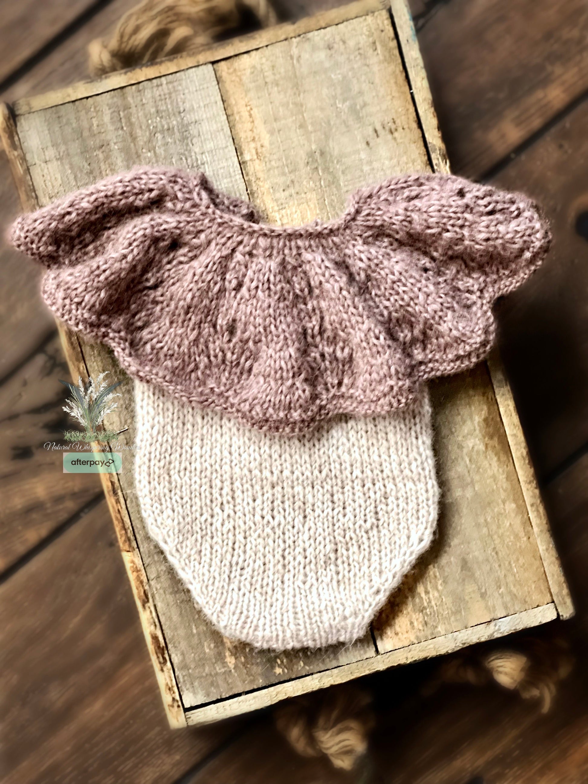 A gorgeously hand knit romper. Perfect for newborns and thick enough to cover up diapers. All knit with brushed alpaca. So scrumptiously soft and very slight halo. This outfit has a button in the back for ease of dressing.