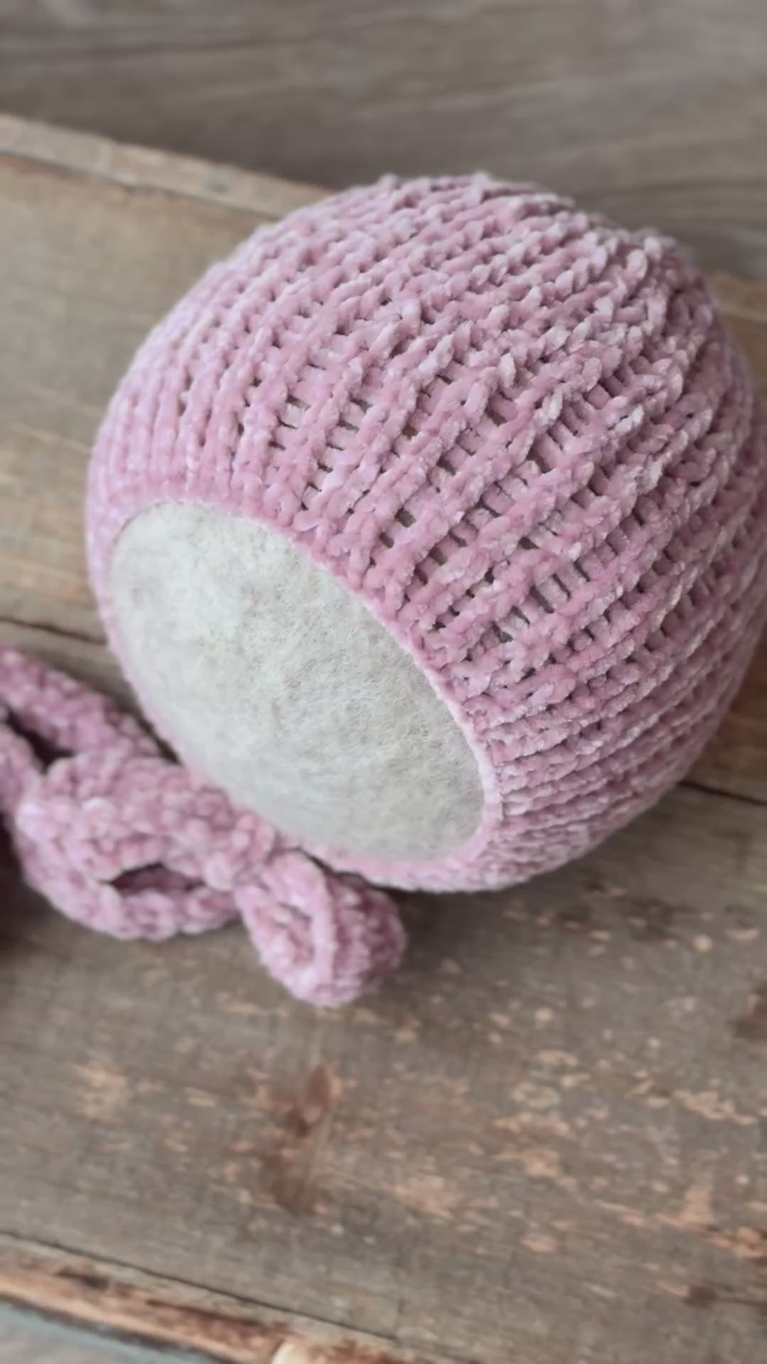 Such a unique style of bonnet. This is super soft. I thought that some like velvet ties why not make a bonnet out of velvet yarn?! So I knit it and with knit ties.