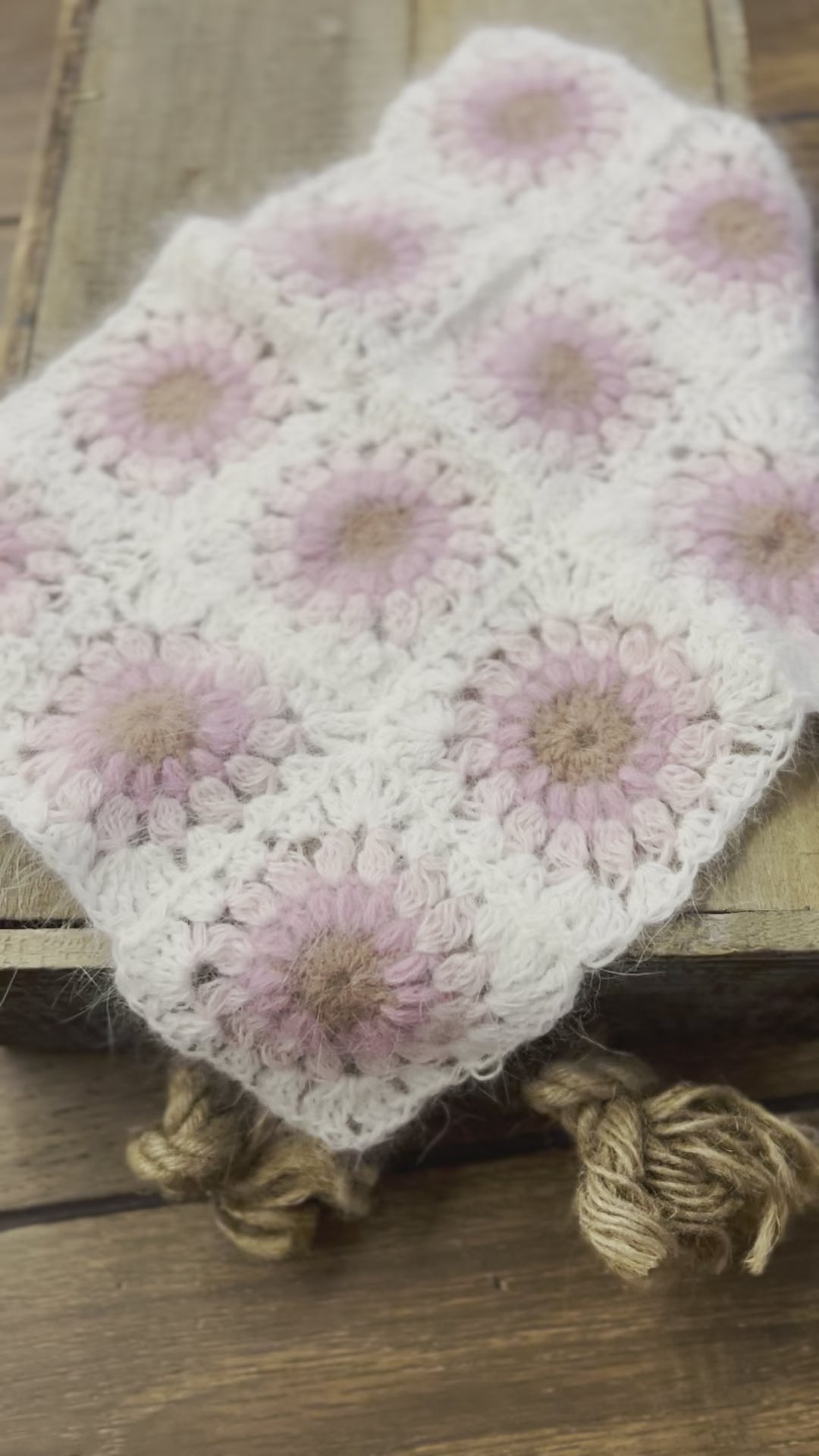 Hand crochet with gorgeous angora in pinks, antique, cream and tan boarder. Works beautifully as a layer, stuffer in a bucket/basket, as a mat for sitters…so many opportunities.